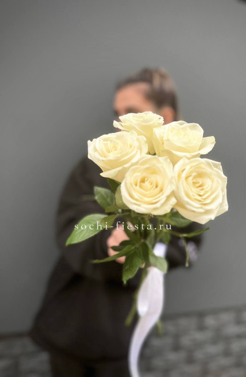 Белоснежные розы в минималистичной подаче отражают современную деловую эстетику. Семь бутонов образуют лаконичную форму без лишних деталей.