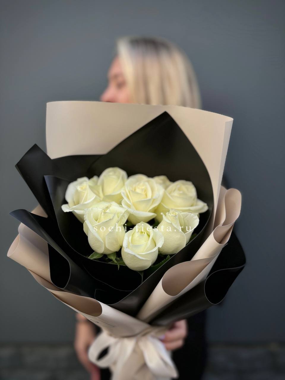 7 белых роз, дизайнерская упаковка. Данная цена доступна при единовременном заказе от 10 шт.