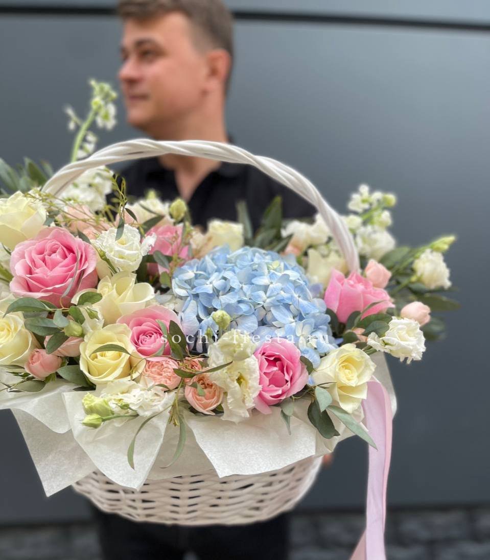 гортензия, диантус, розовая роза, эустома, гербера, корзина средняя, наполнение.
