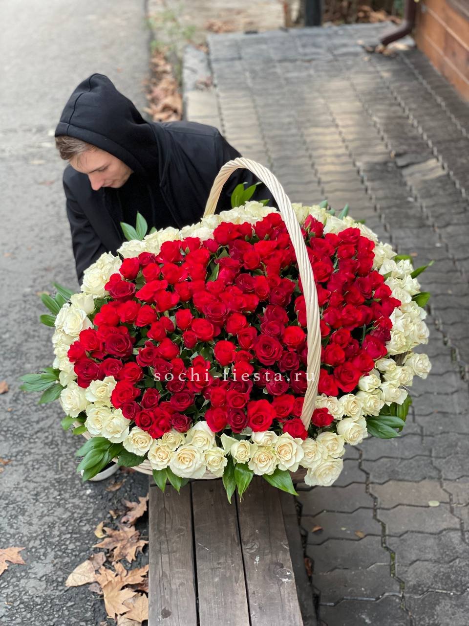 Корзина вмещает двести один бутон, образующих пышное цветочное полотно. Классическая форма подачи позволяет разместить композицию в любом пространстве без необходимости искать вазу. Впечатляющий объем для важных событий.