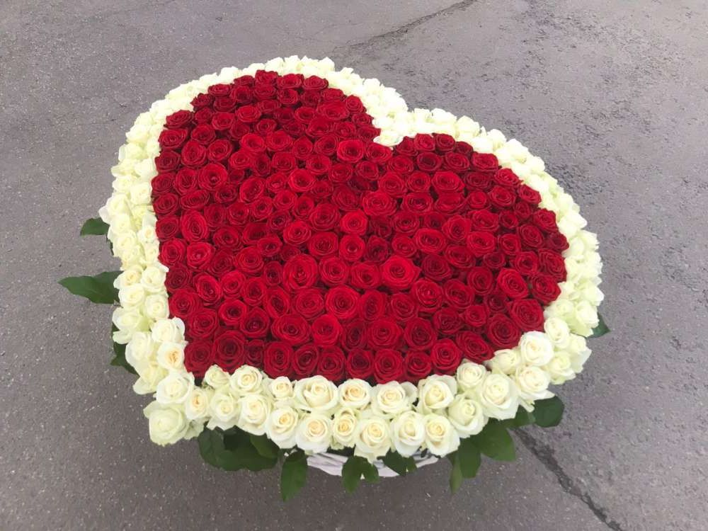 Пятьсот пятьдесят пять роз в корзине с персональной надписью — это целая инсталляция из живых цветов. Объём композиции впечатляет масштабом и создаёт незабываемое визуальное присутствие.