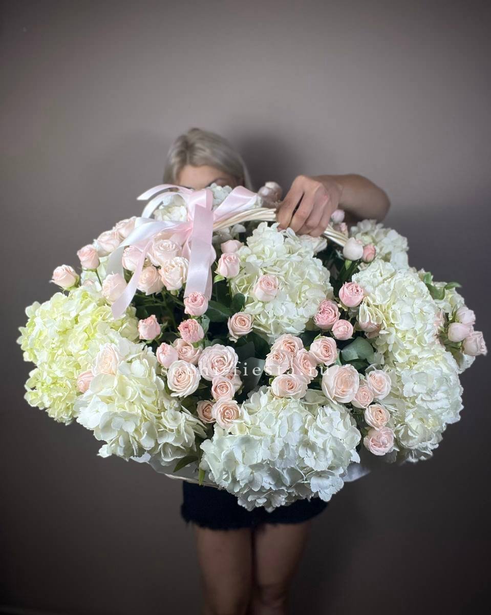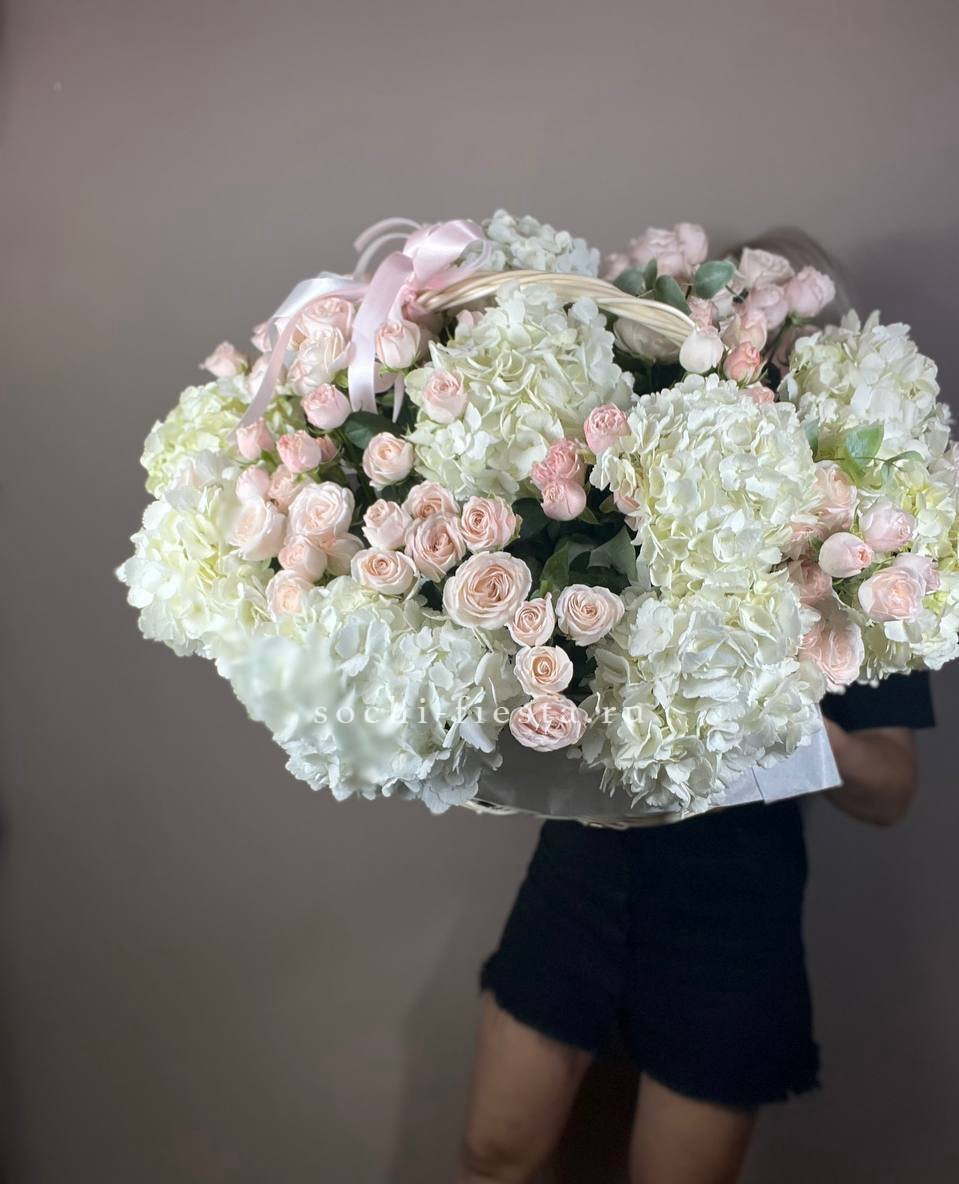 цветочная корзина с розами, мисти баблс, диантусами и гортензией.