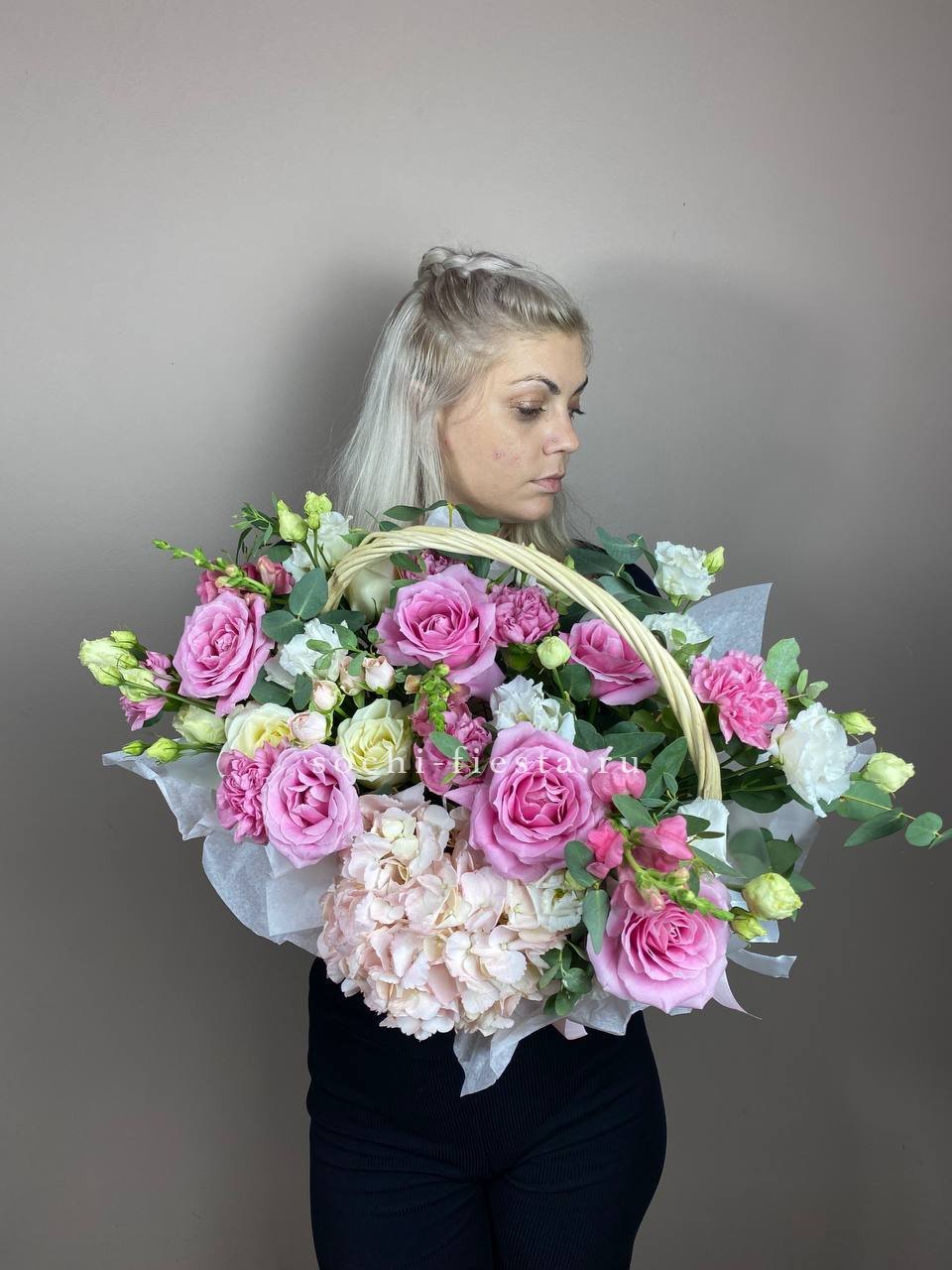 гортензия нежно-розовых оттенков, эустома, пионовидная кустовая роза, эвкалипт, диантус, антиринум, розы, лента, корзина.
