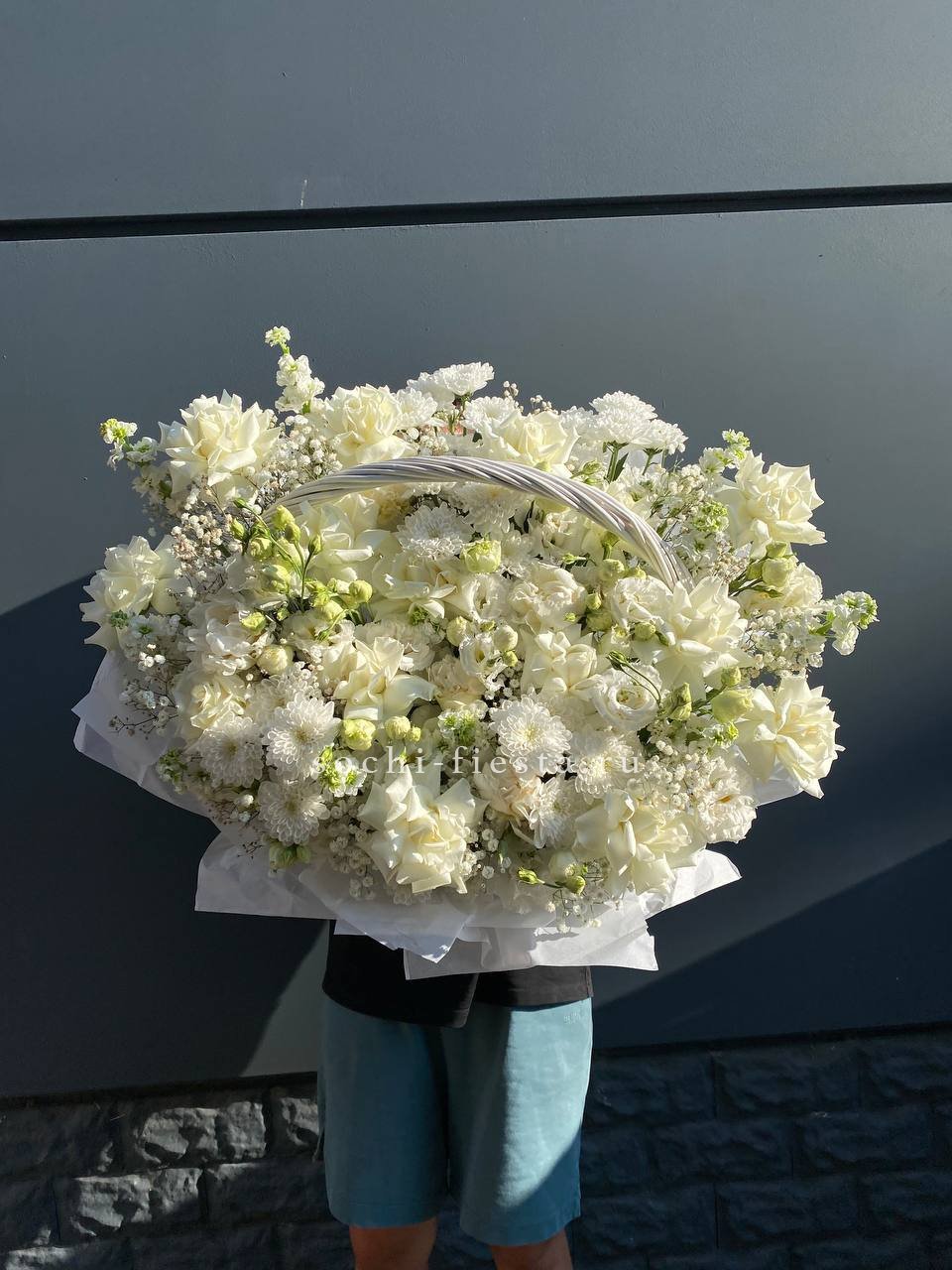 Белые розы и эустома образуют воздушную композицию с мягкими переходами между соцветиями. Хризантемы и маттиола добавляют объема, а гипсофила создает легкую дымку по краям. Корзина выглядит свежо и собранно в любом пространстве.