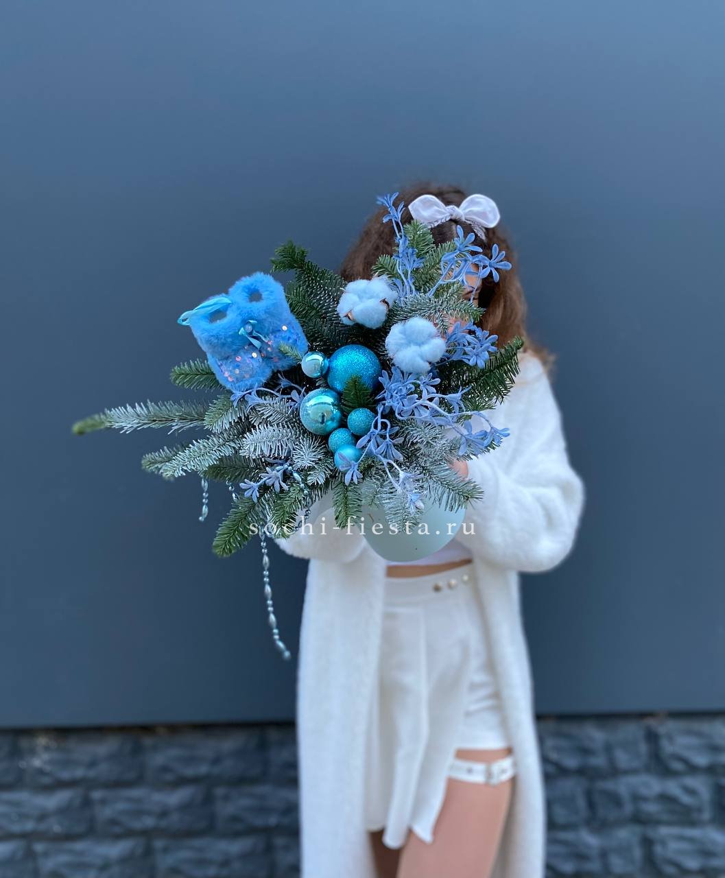 Новогодняя композиция в цилиндре с веточками нобилиса и миниатюрными сапожками создает уютную зимнюю историю. Голубые игрушки и декоративные элементы вносят свежую ноту в традиционную праздничную гамму.