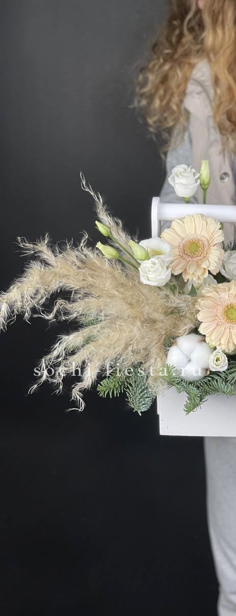 Герберы и эустома раскрываются среди хвойной зелени, образуя мягкий цветовой переход. Хлопок и сухоцветы добавляют композиции природной фактуры, а датский нобилис держит форму в любом пространстве.