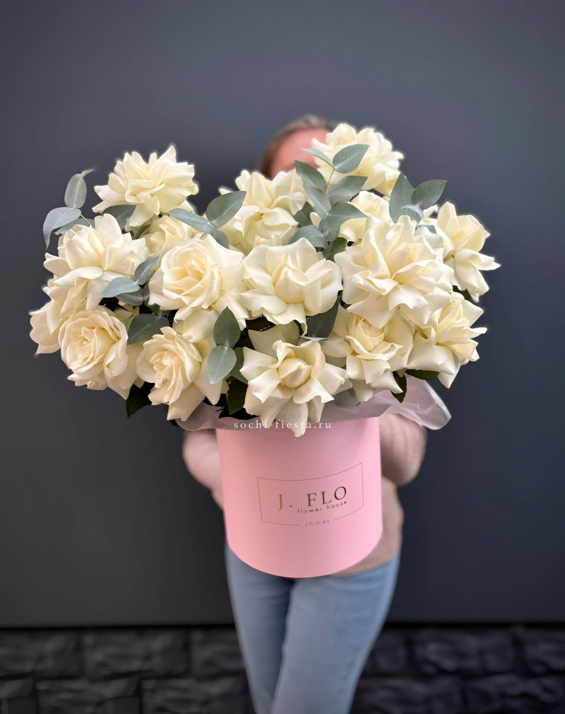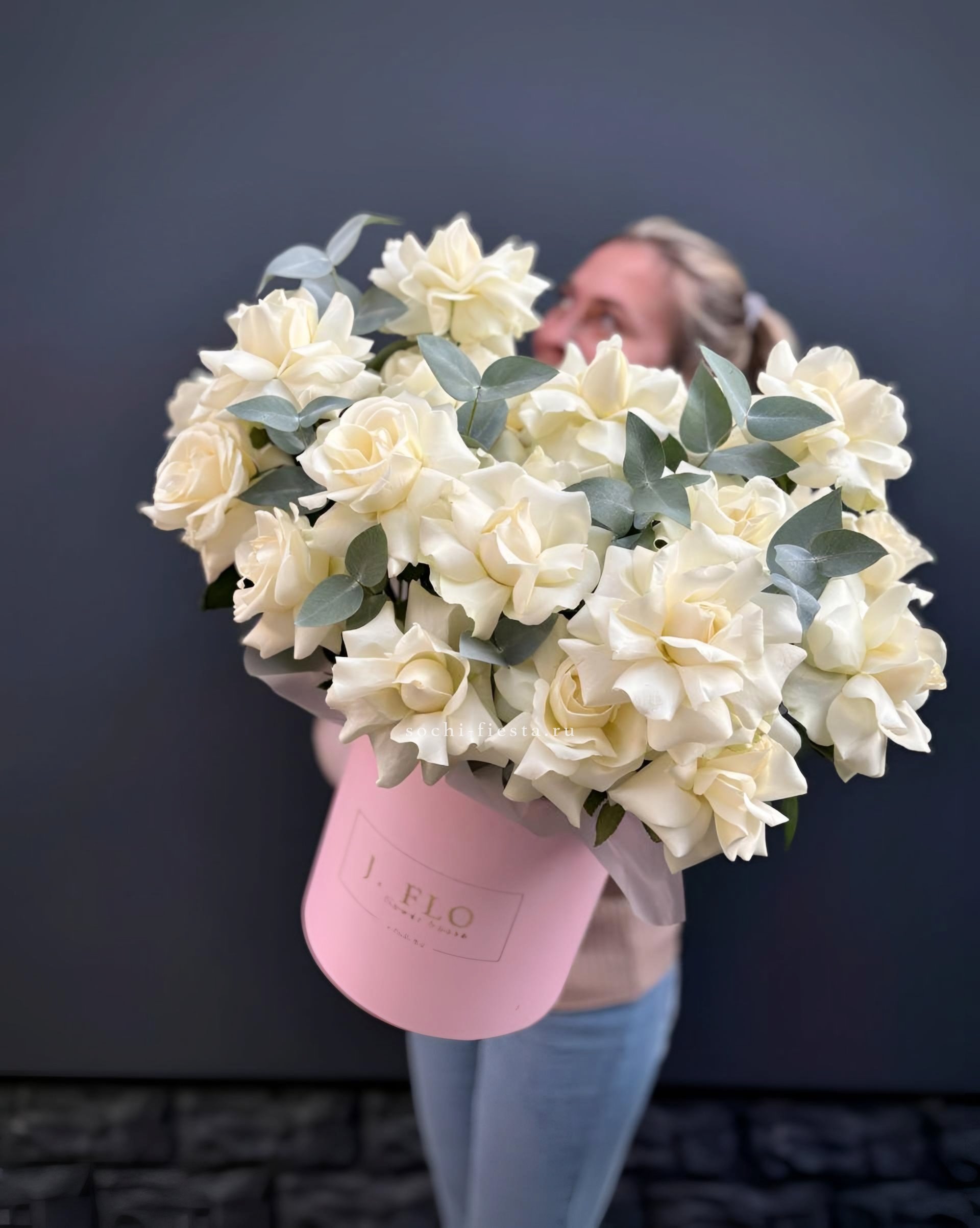 Белоснежные орхидеи и розовые розы собраны в природном джутовом кашпо. Воздушная гипсофила добавляет композиции легкости, а эвкалипт привносит свежие нотки.