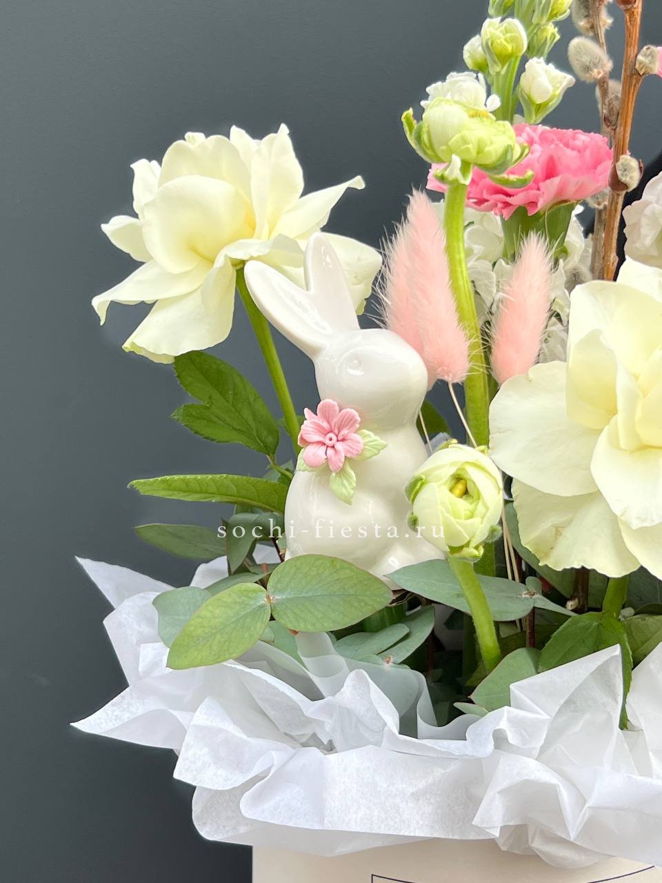 Цветочная композиция идеальна для Православных Праздников! Состав выполнен из белых роз, вербы, маттиолы, лагуруса и керамического кролика!