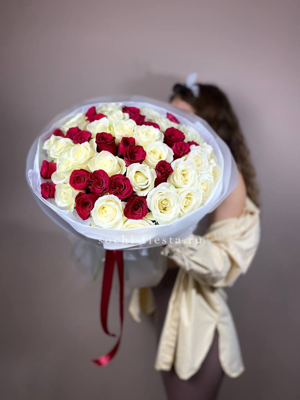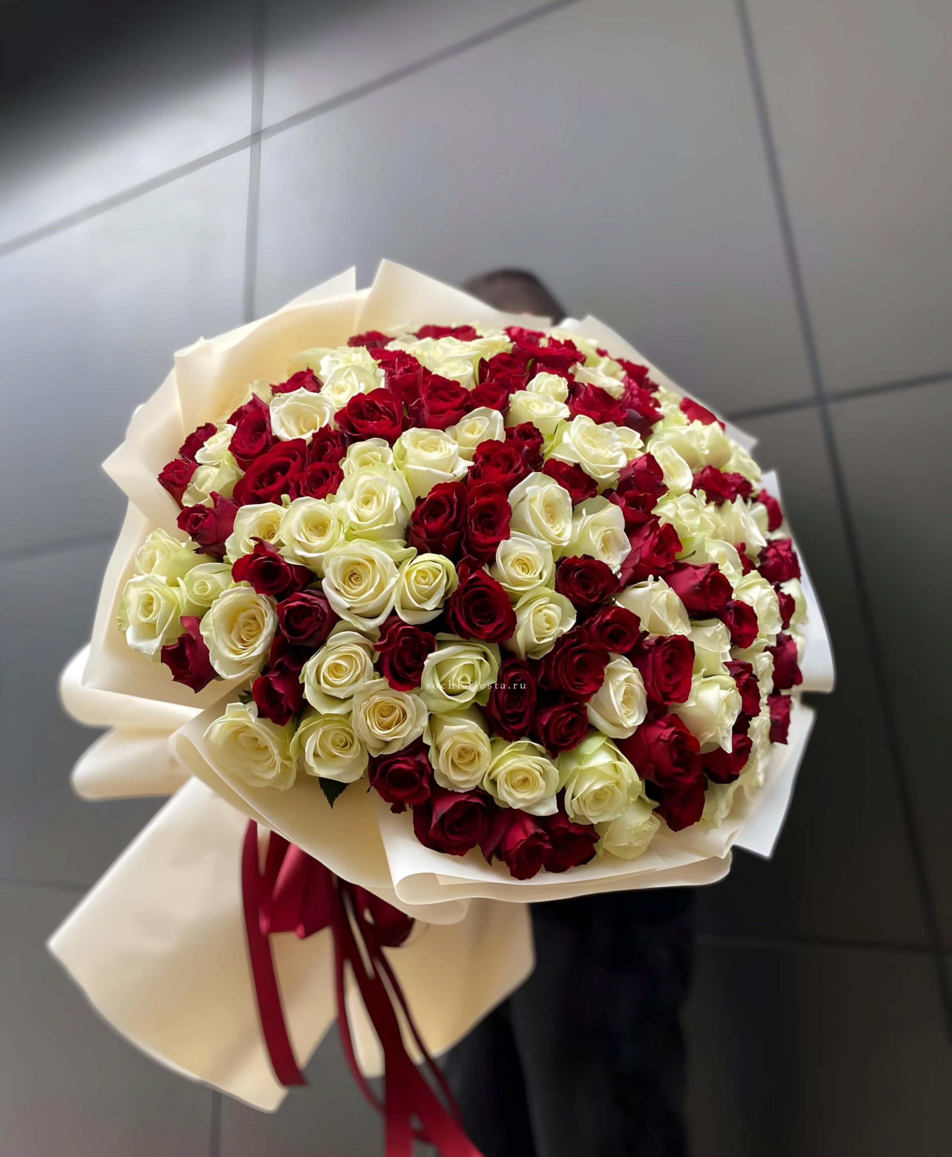 Длинные стебли и крупные бутоны в палитре микс создают букет с графичным силуэтом. Сто одна роза выстраивается в плотную композицию с выразительной вертикалью.
