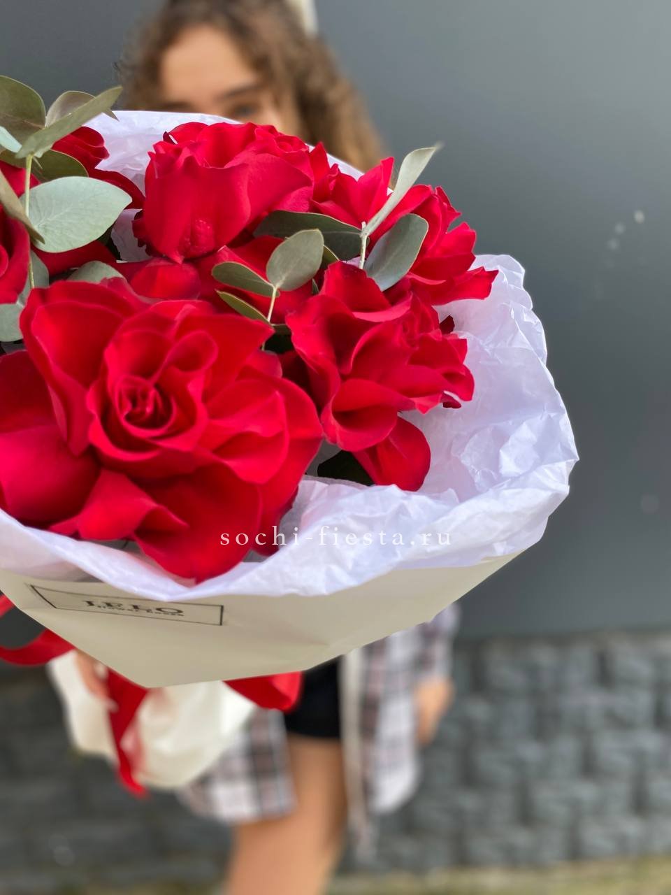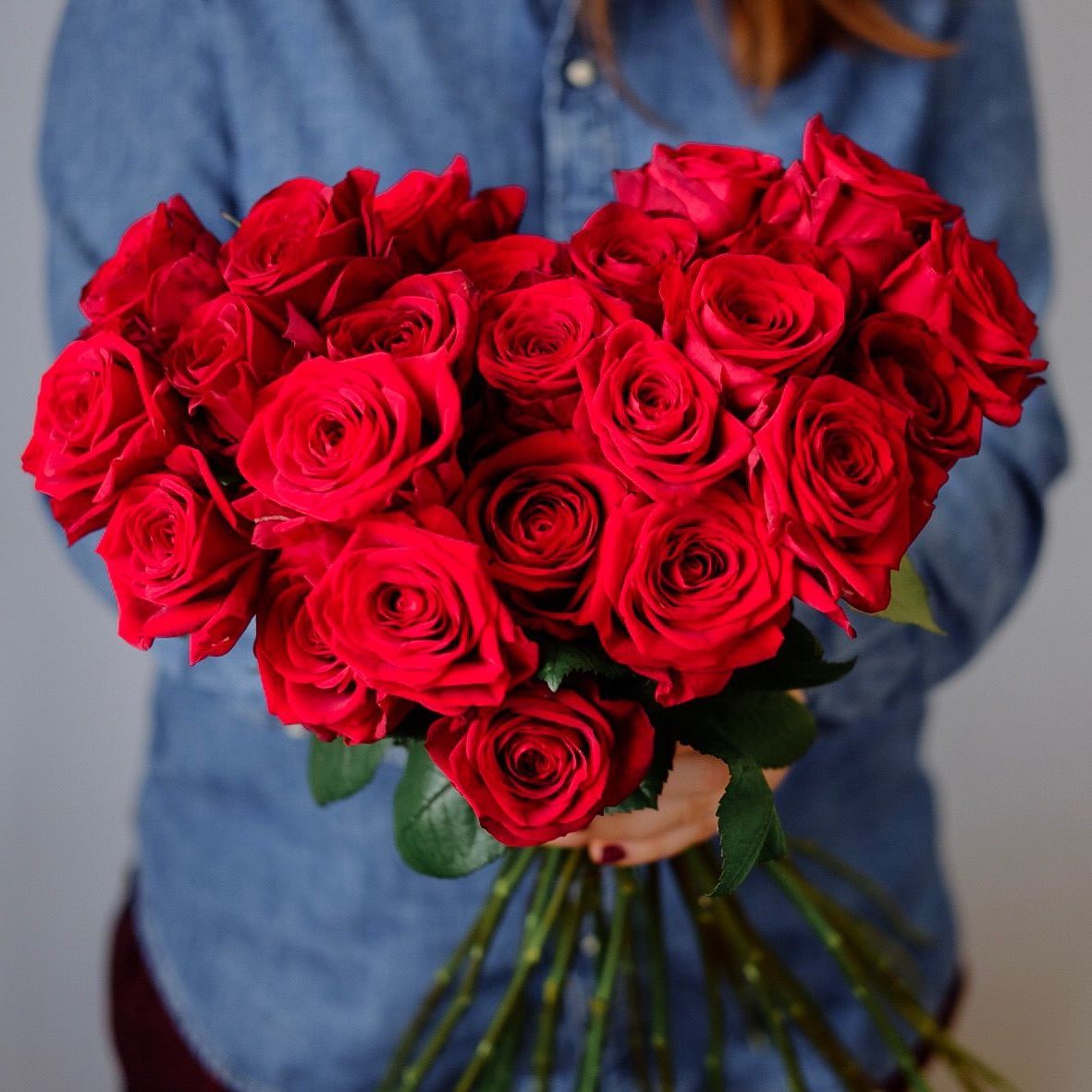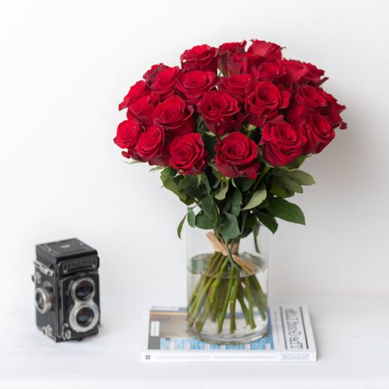 Сто один бутон сорта Лолита раскрывается бархатными лепестками глубокого красного цвета. Высокие стебли формируют объемную композицию с выразительным силуэтом. Классика в современной подаче.