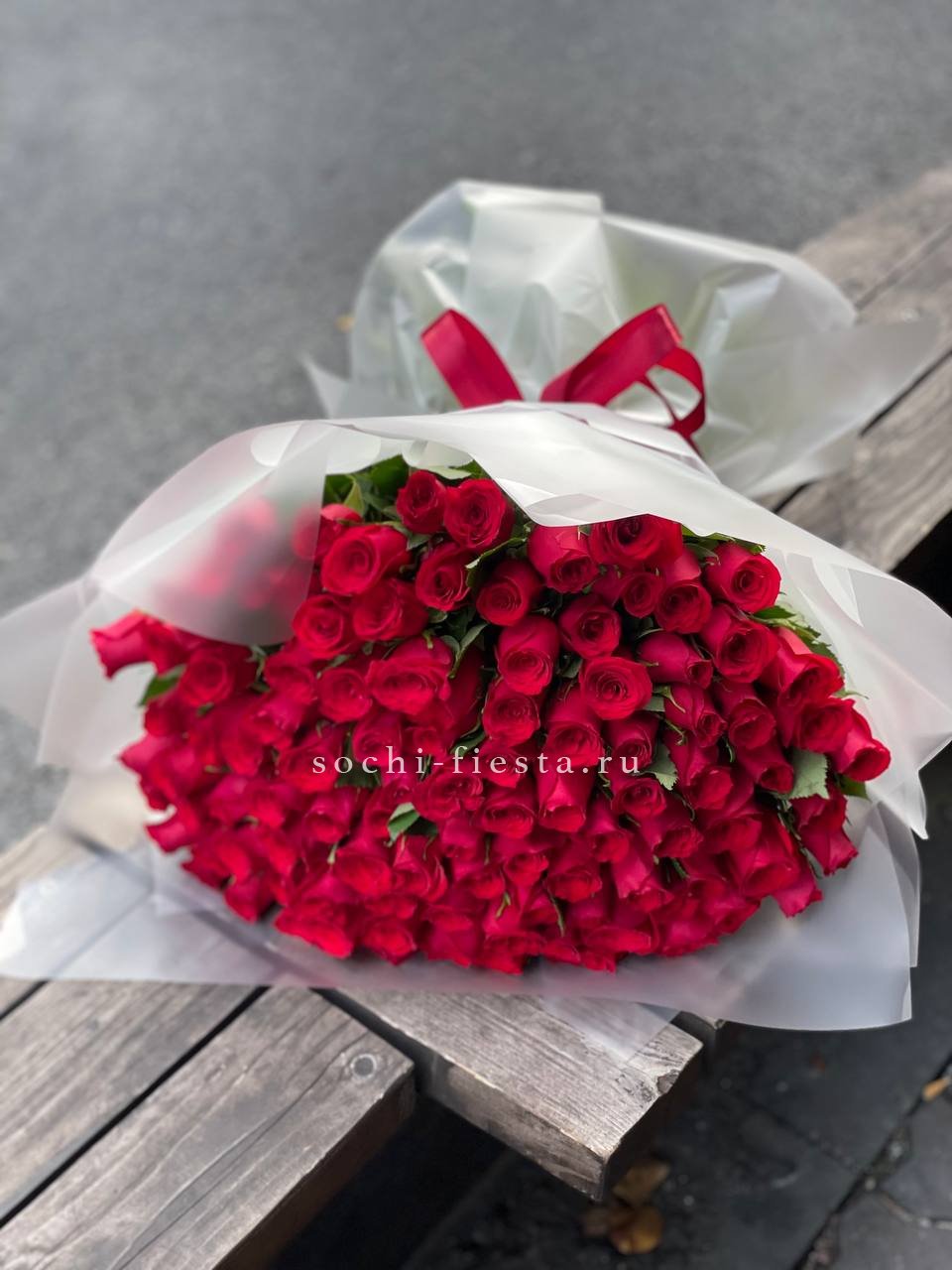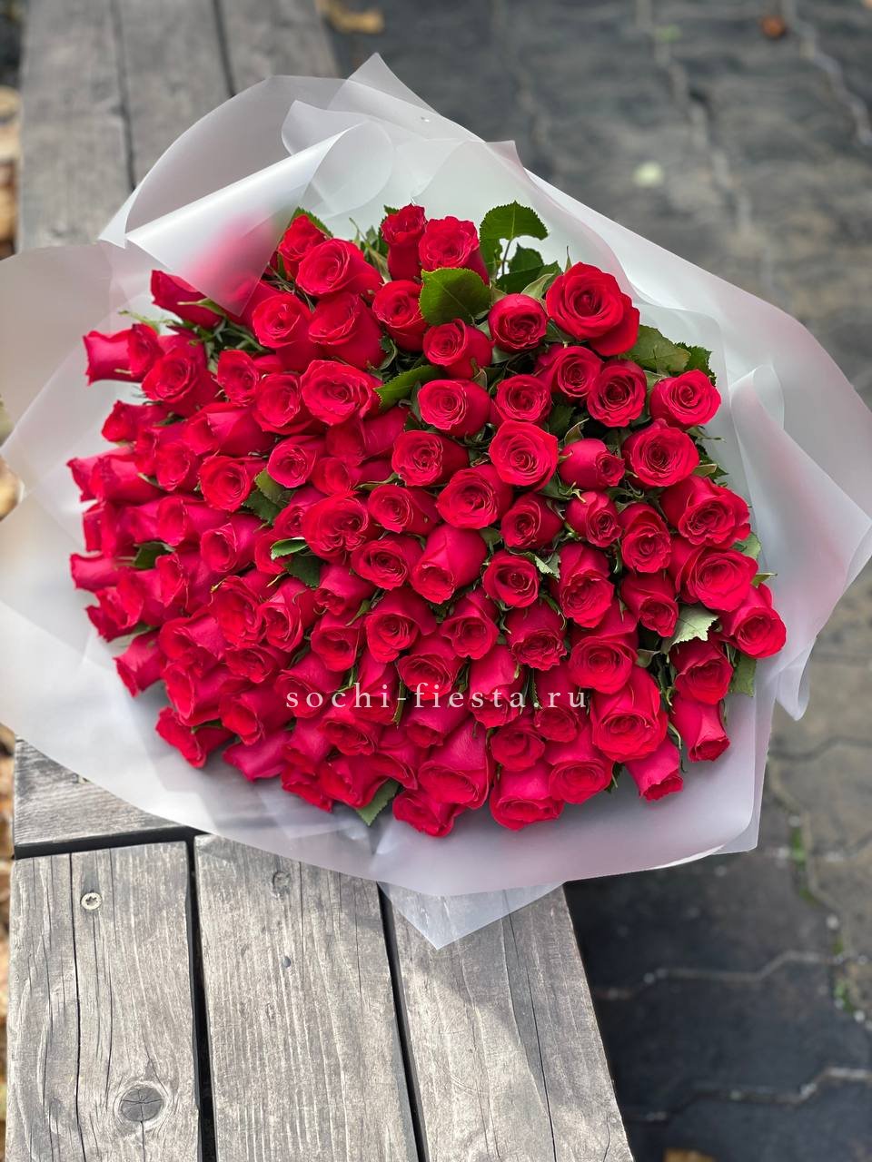 101 красная роза, лента, упаковка.