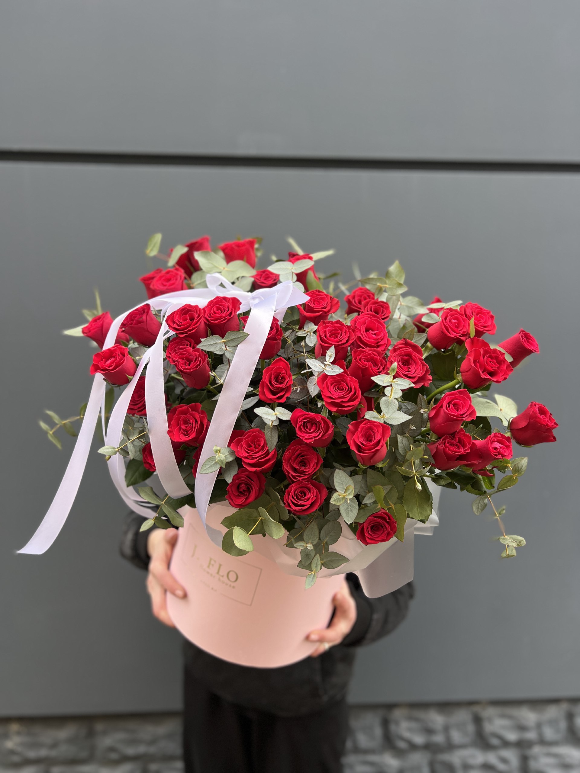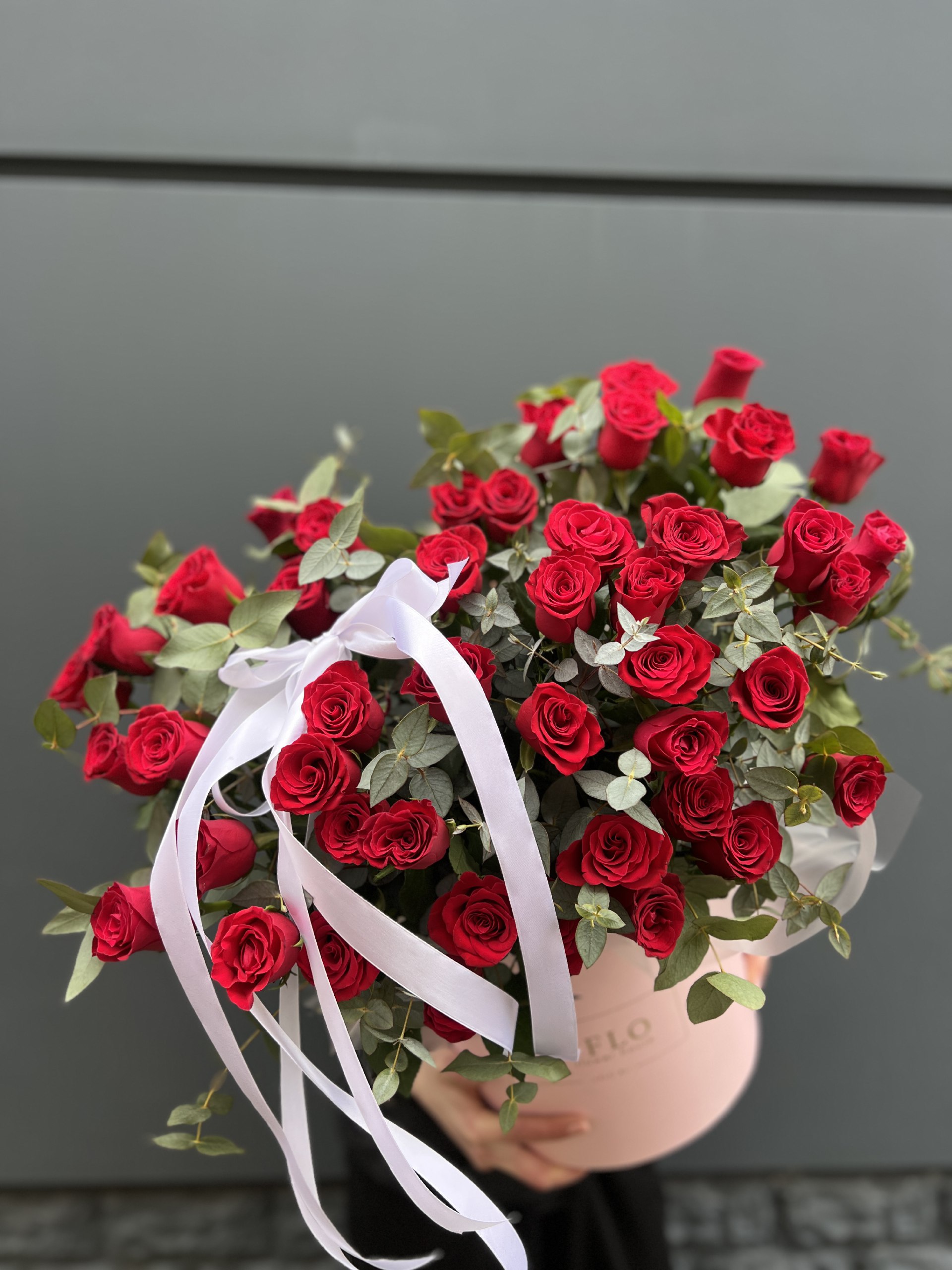 Сто одна роза насыщенного алого оттенка собрана в плетеной корзине. Плотная округлая форма создает впечатление цветочного купола. Практичное решение для масштабного жеста.