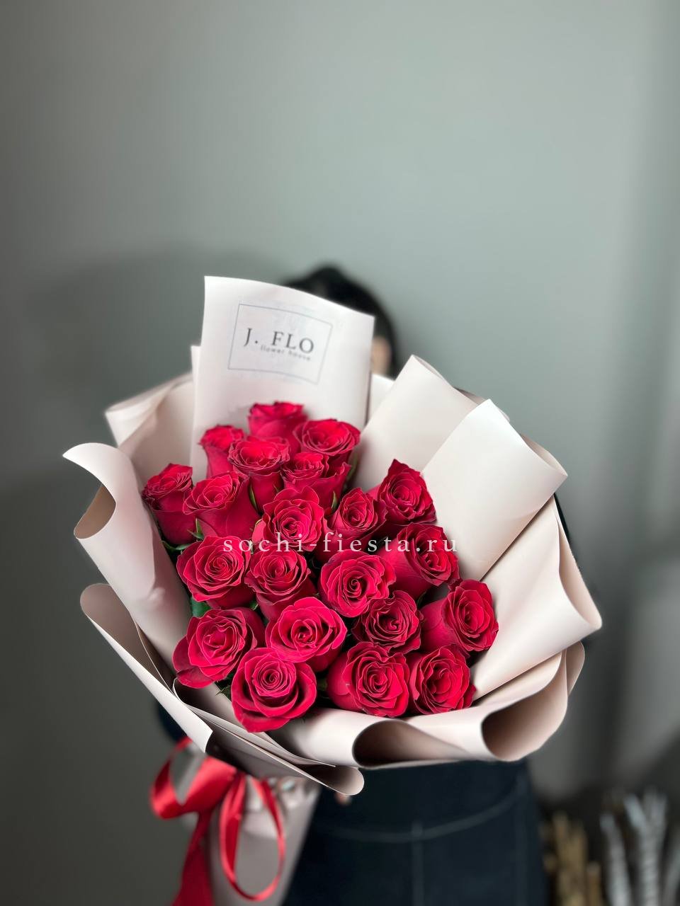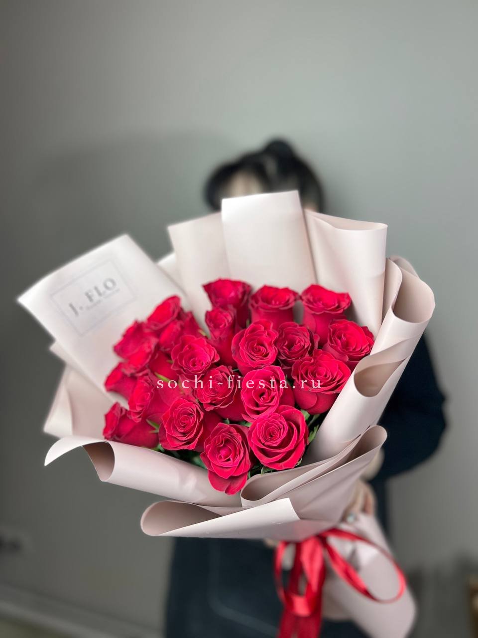 Классическая красная палитра раскрывается в композиции из двадцати пяти роз с добавлением эвкалипта. Матовая зелень оттеняет насыщенность бутонов и придает букету завершенность.