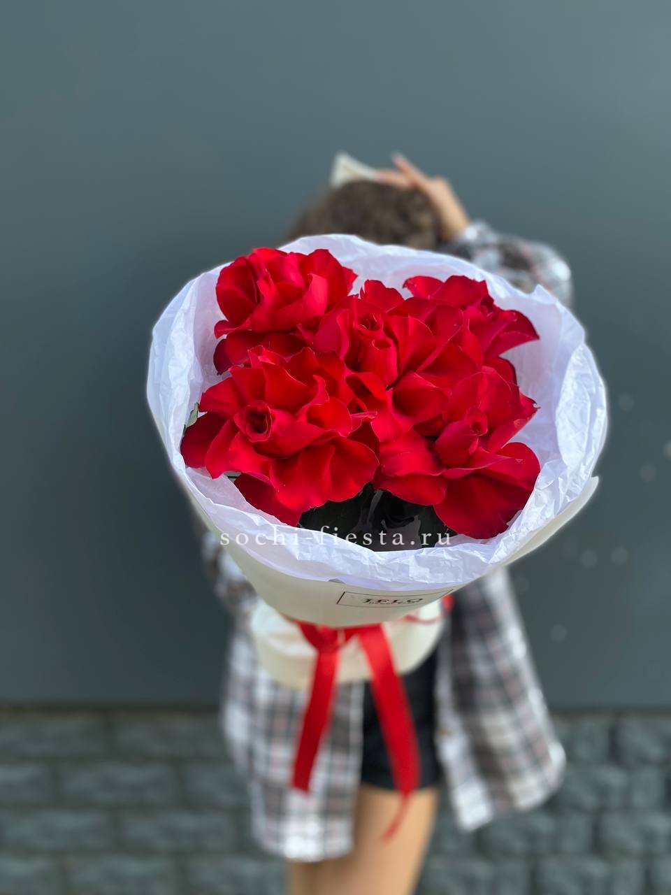 Красные розы в обрамлении чёрного материала — это игра света и тени в одном букете. Тёмный фон усиливает яркость алых лепестков и добавляет композиции графичности.