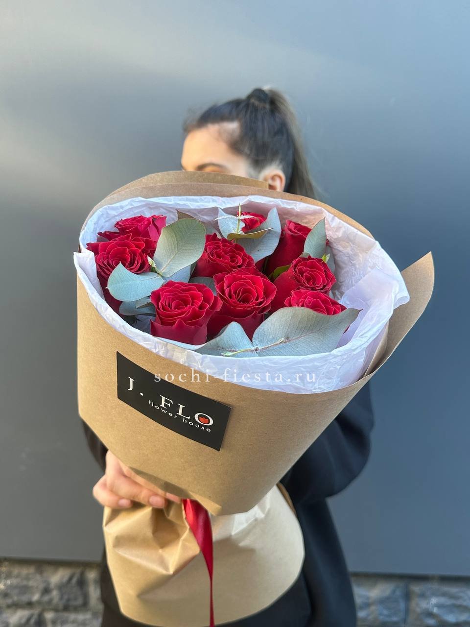 9 красных роз, эвкалипт, лента, крафт.