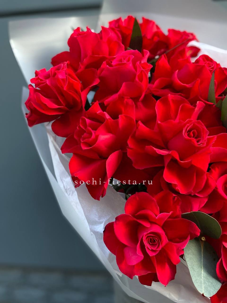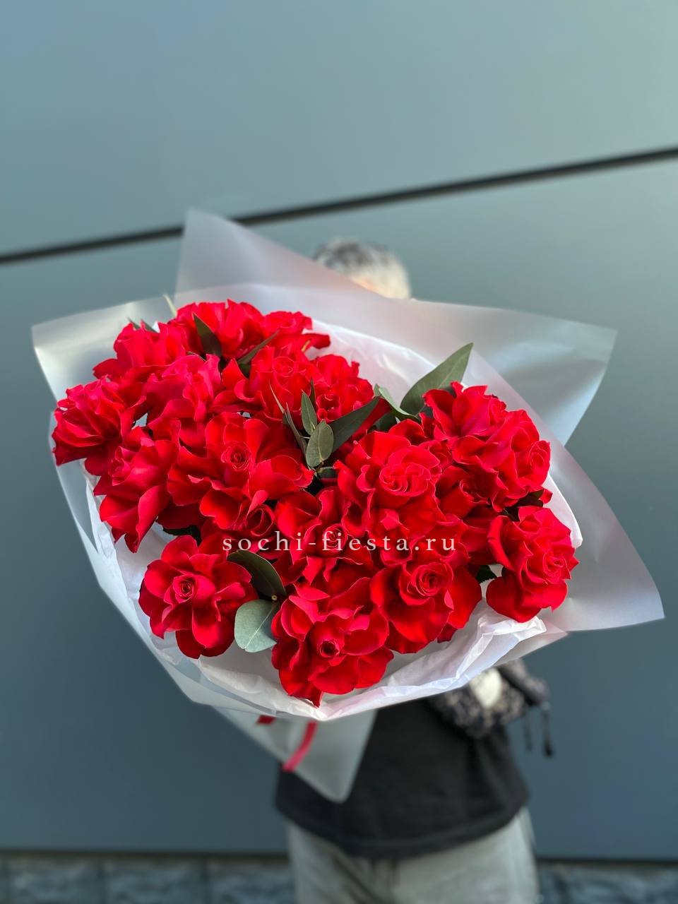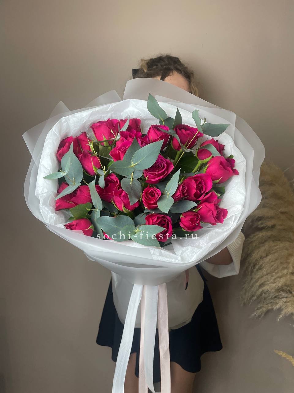 Вывернутые лепестки французских роз раскрываются широко и создают объёмную текстуру. Пампасная трава добавляет воздушности и смягчает линии. Пятнадцать бутонов в авторской упаковке выглядят свежо и современно.