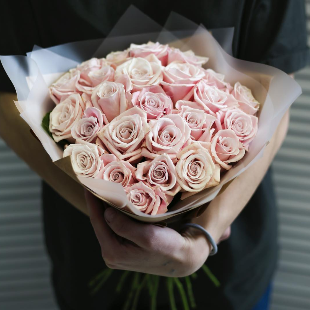 Двадцать пять бутонов кремового оттенка собраны в классический монобукет. Мягкая палитра и округлая форма создают спокойное впечатление без лишней декоративности.