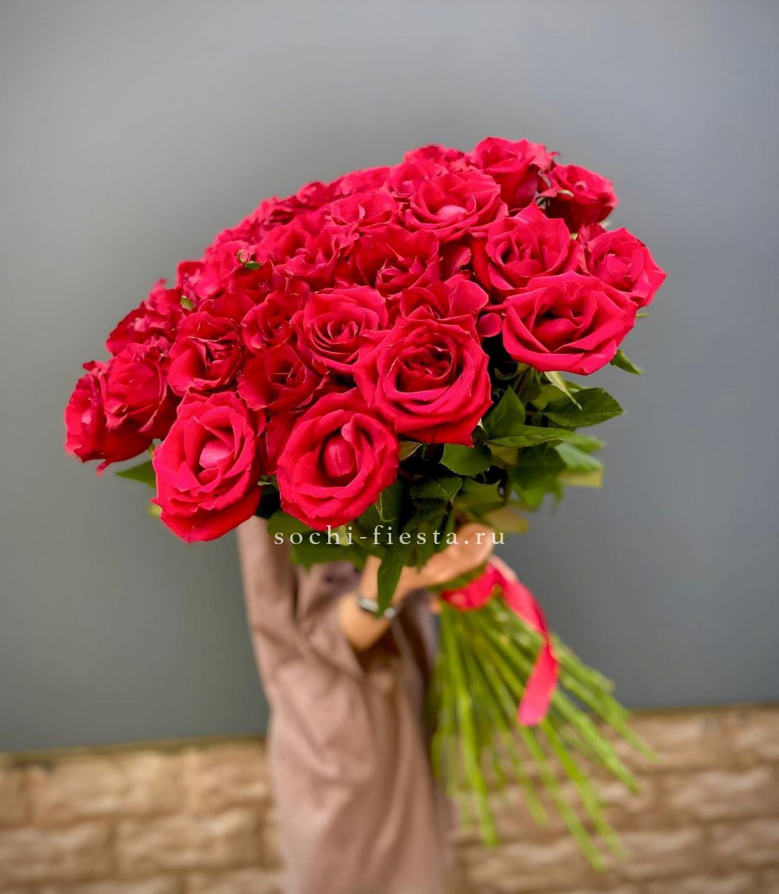 Пятьдесят один бутон насыщенного красного оттенка собраны в плотную композицию. Длинные стебли создают графичный силуэт, а классическая форма сохраняет торжественный характер без лишних деталей.