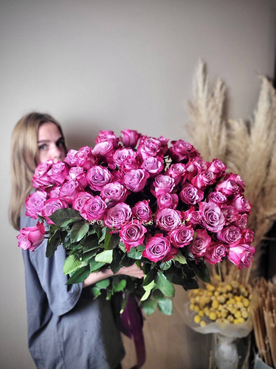 Глубокий фиолетовый оттенок роз Deep Purple создает почти графичное впечатление. Высокие стебли собраны в свободную охапку, где каждый бутон читается отдельно и при этом держит общий ритм.