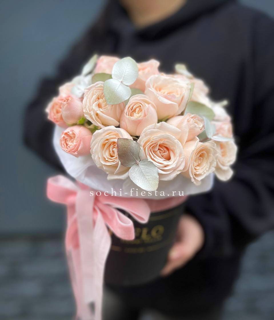 Тридцать пять пионовидных кустовых роз собраны в плетеной корзине и дополнены серебристым эвкалиптом. Округлые бутоны формируют объемную шапку светлых оттенков. Композиция легко размещается на столе и сохраняет форму.