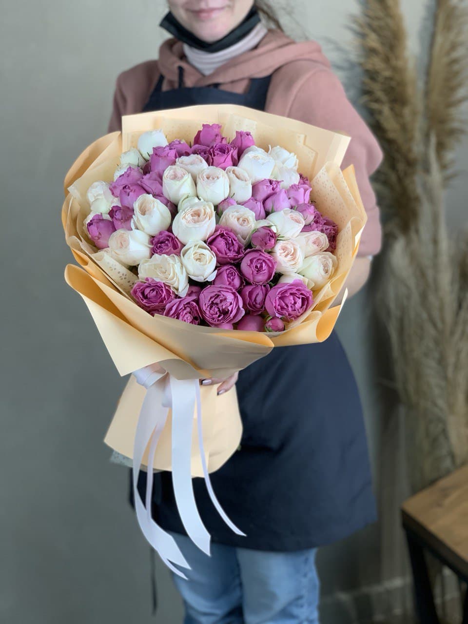Минимальный состав: 35 пионовидных кустовых роз Мисти бабблс, лента, авторское оформление.