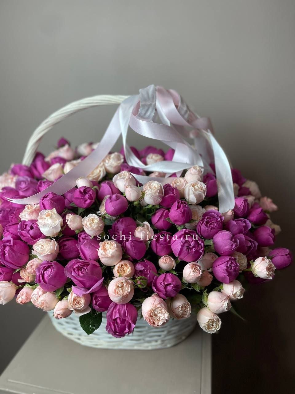 Двести один бутон двух сортов заполняют корзину до краёв. Бомбастик и Мисти Баблс чередуются оттенками, создавая мягкие переливы в общей массе пышных соцветий без единого просвета.