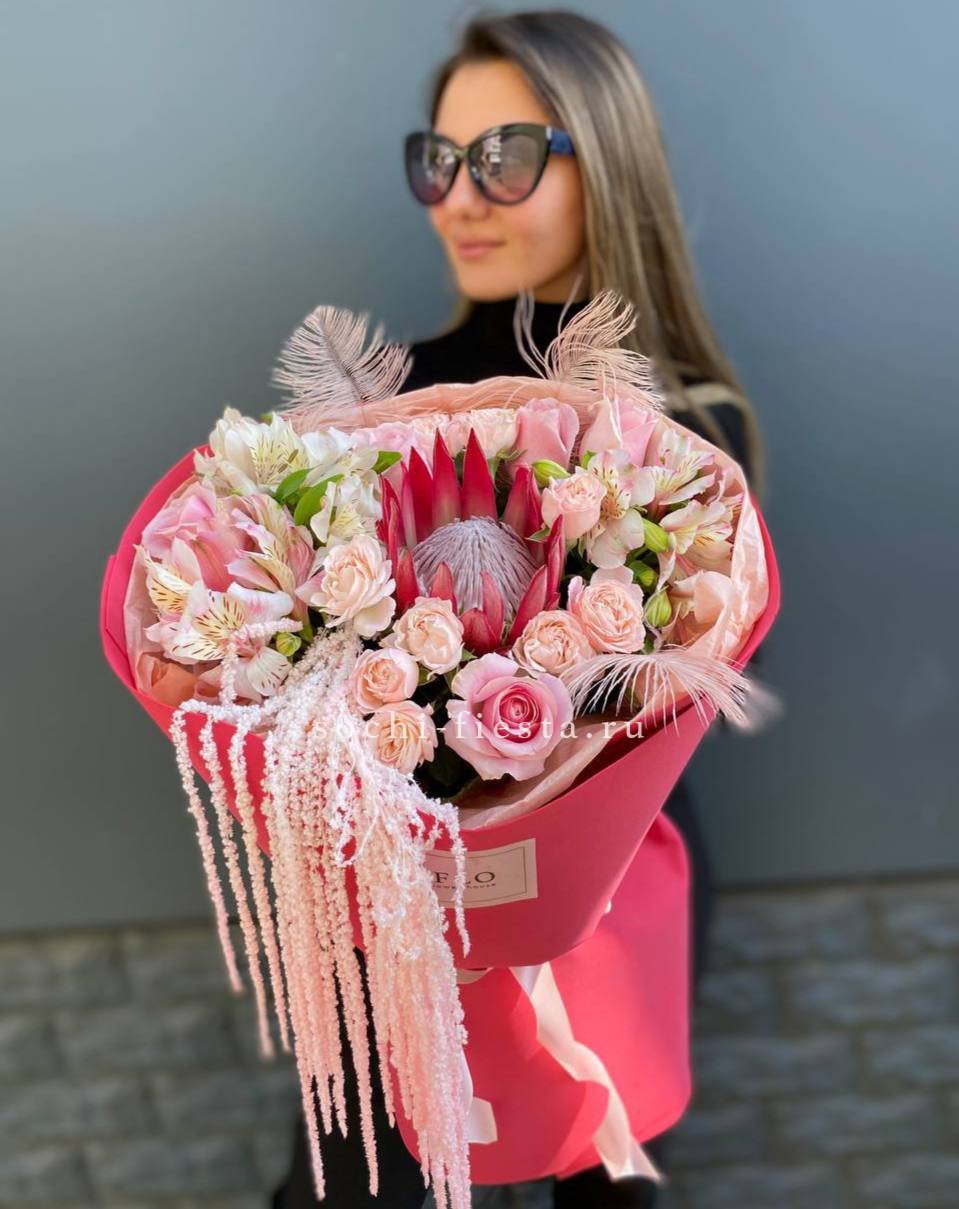 протея, кустовые розы, одноголовые розы, альстромерии, перья, амарант, лента и дизайнерская пленка.
