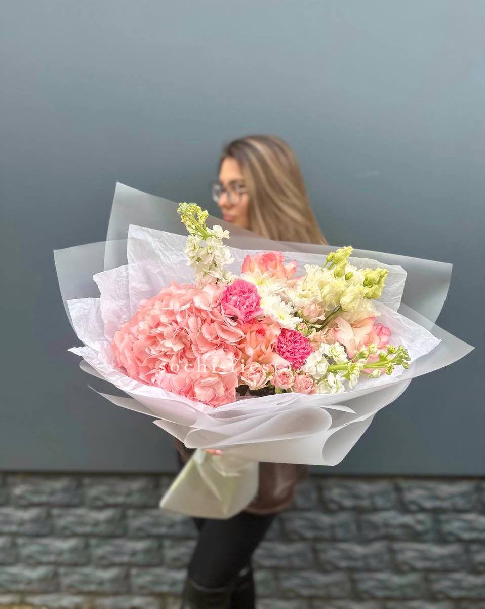 Маттиола задает вертикальный ритм всей композиции, а гортензия заполняет пространство мягкими шапками. Диантусы и хризантемы создают живую текстуру между основными линиями.