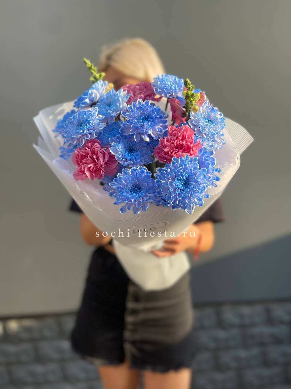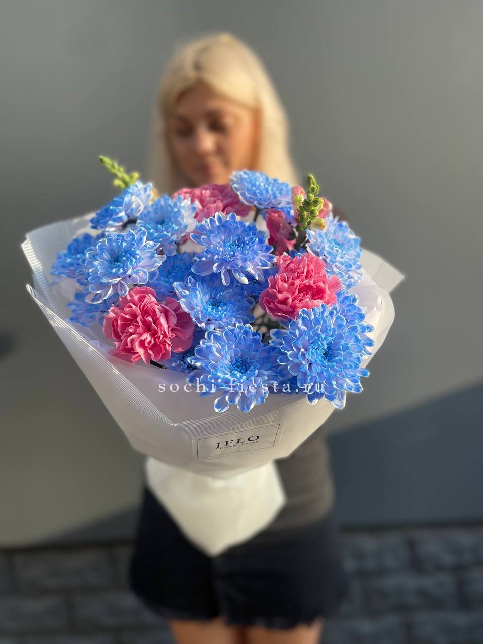 маттиола, розы, гортензия, диантусы, хризантемы , лента и дизайнерская пленка.
