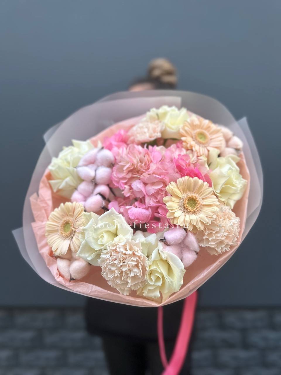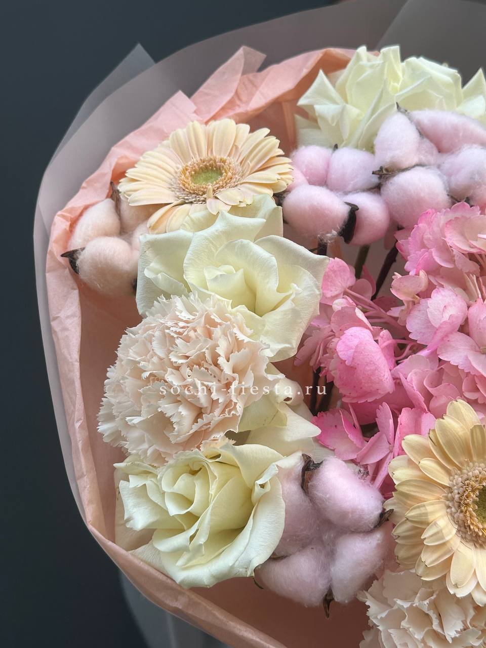 гербера, роза, гортензия, упаковка.