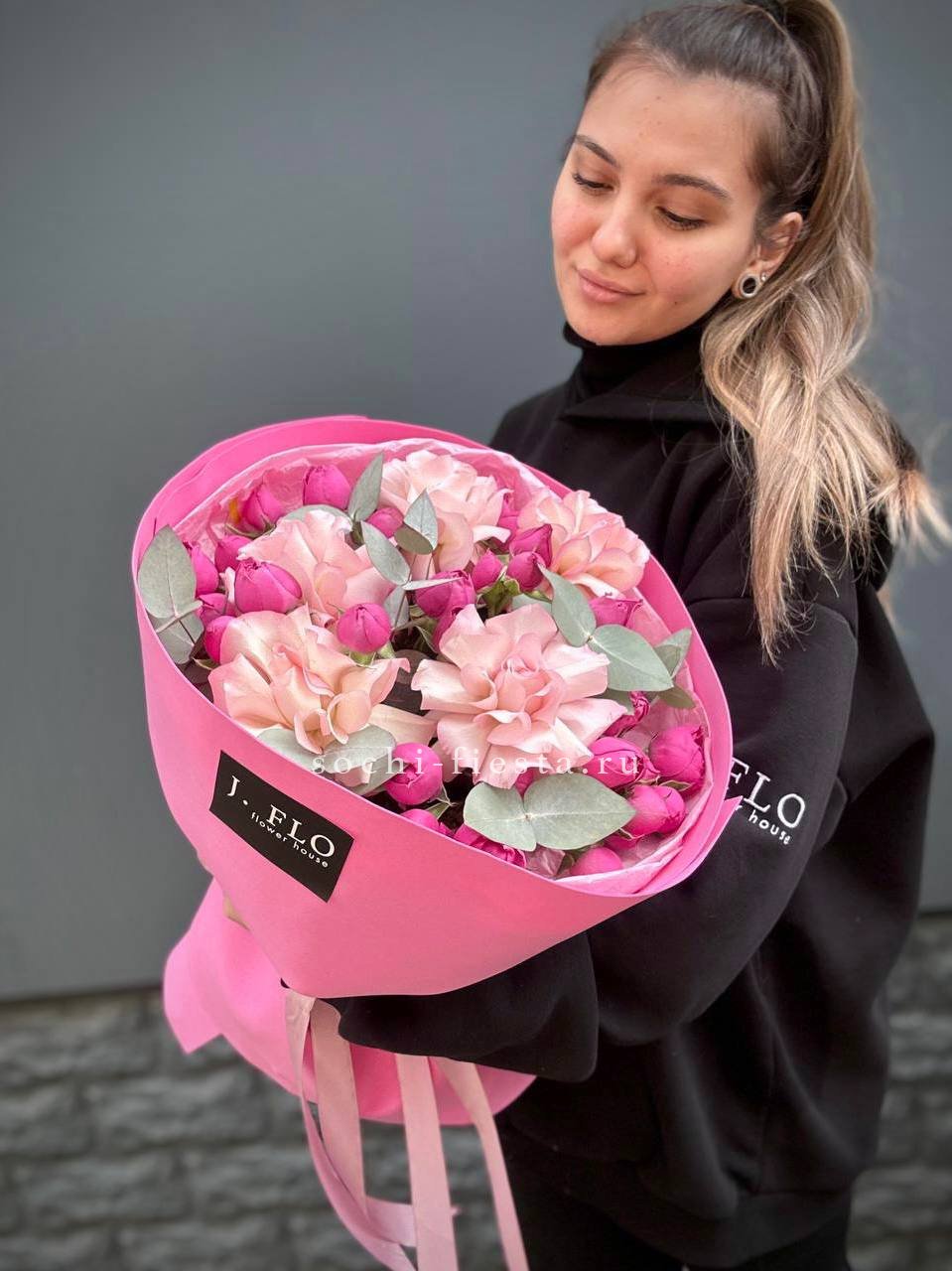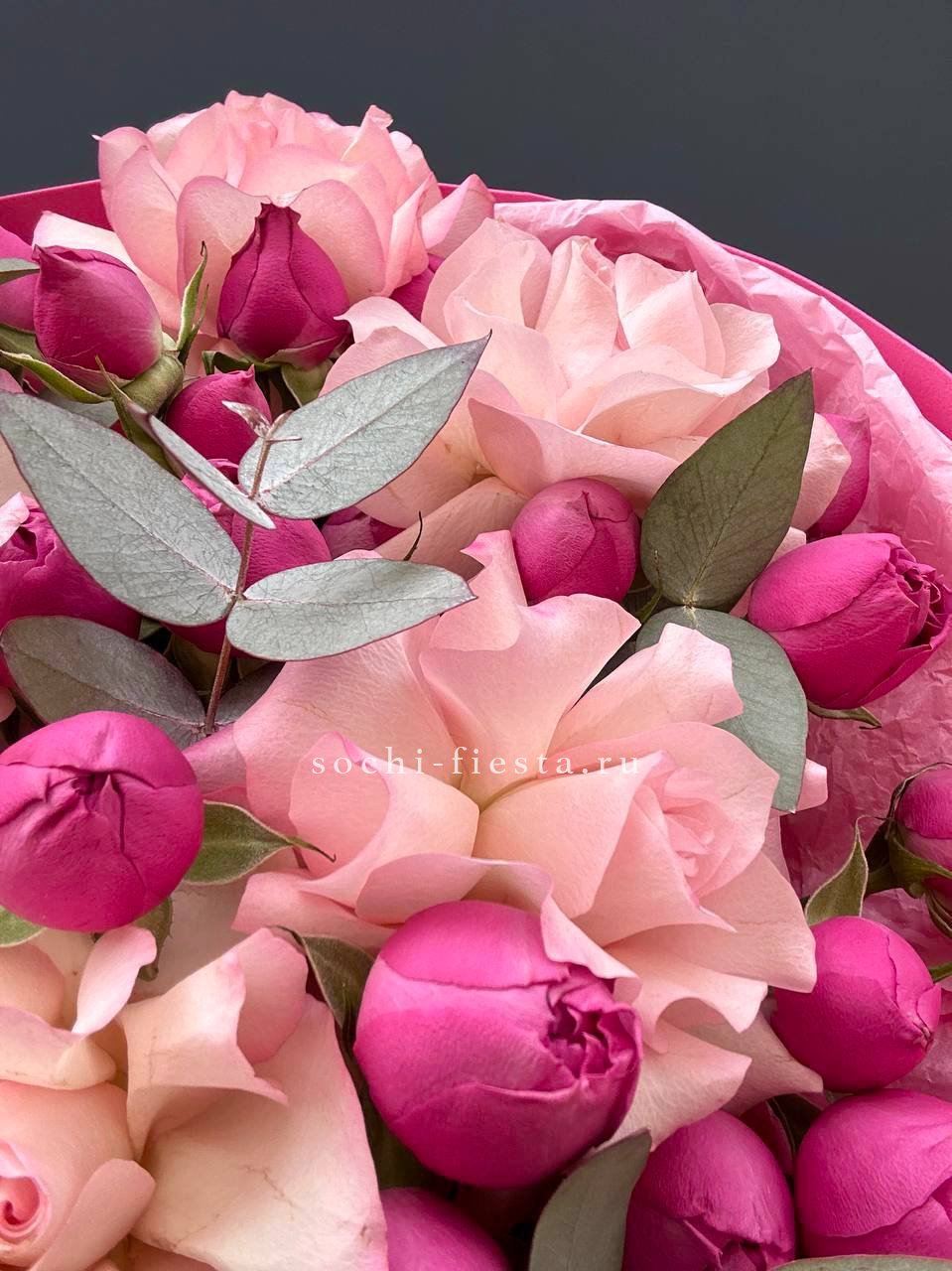 гортензия, розовые розы, диантусы, эустома, маттиолы, эвкалипт лента и дизайнерская пленка.