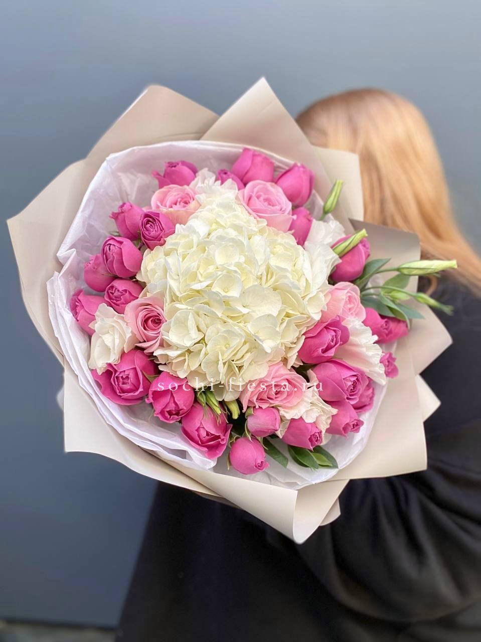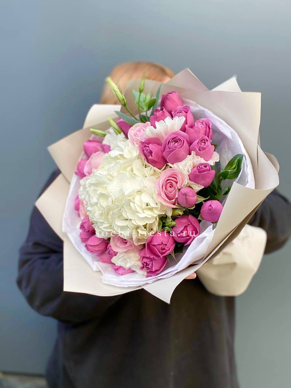 гортензия, роза, эустома, бомбастик,  эвкалипт, лента, дизайнерская пленка.