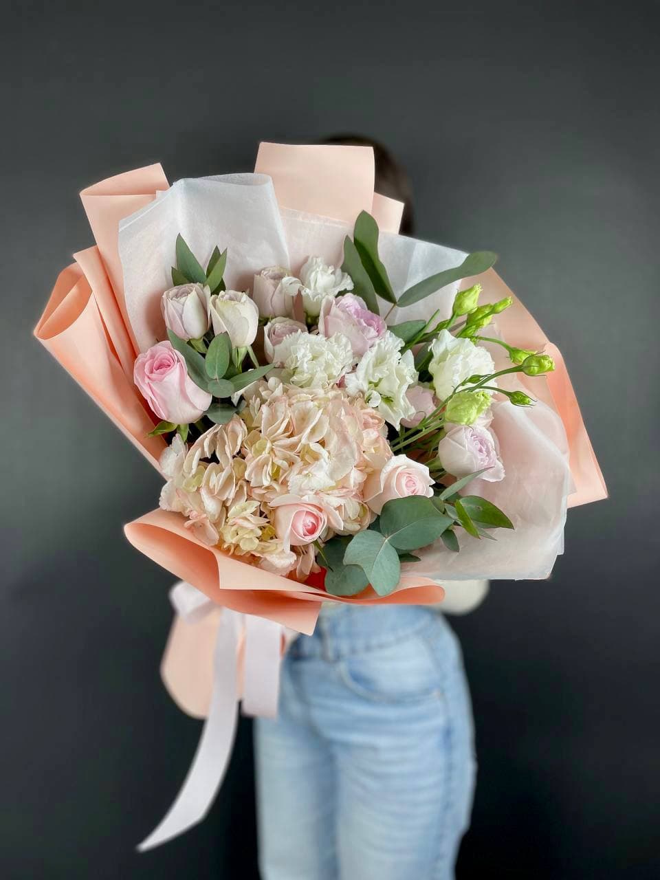 гортензия, французские (вывернутые) розы, лента, дизайнерская пленка, тишью.