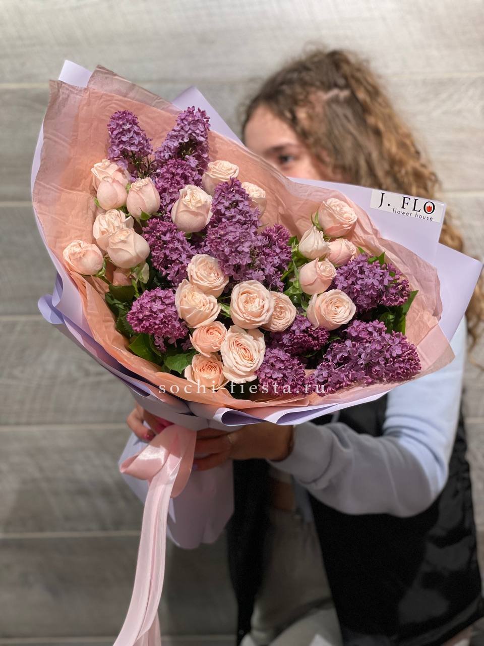 Сирень обвивает пышные бутоны пионовидных роз и задает мягкий лиловый ритм всей композиции. Букет дышит весной и заполняет пространство ароматом. Форма свободная, но собранная.