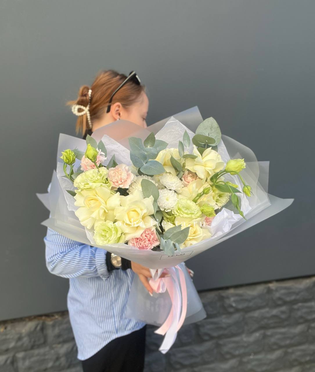диантус, розы, бомбастик, эвкалипт, упаковка.