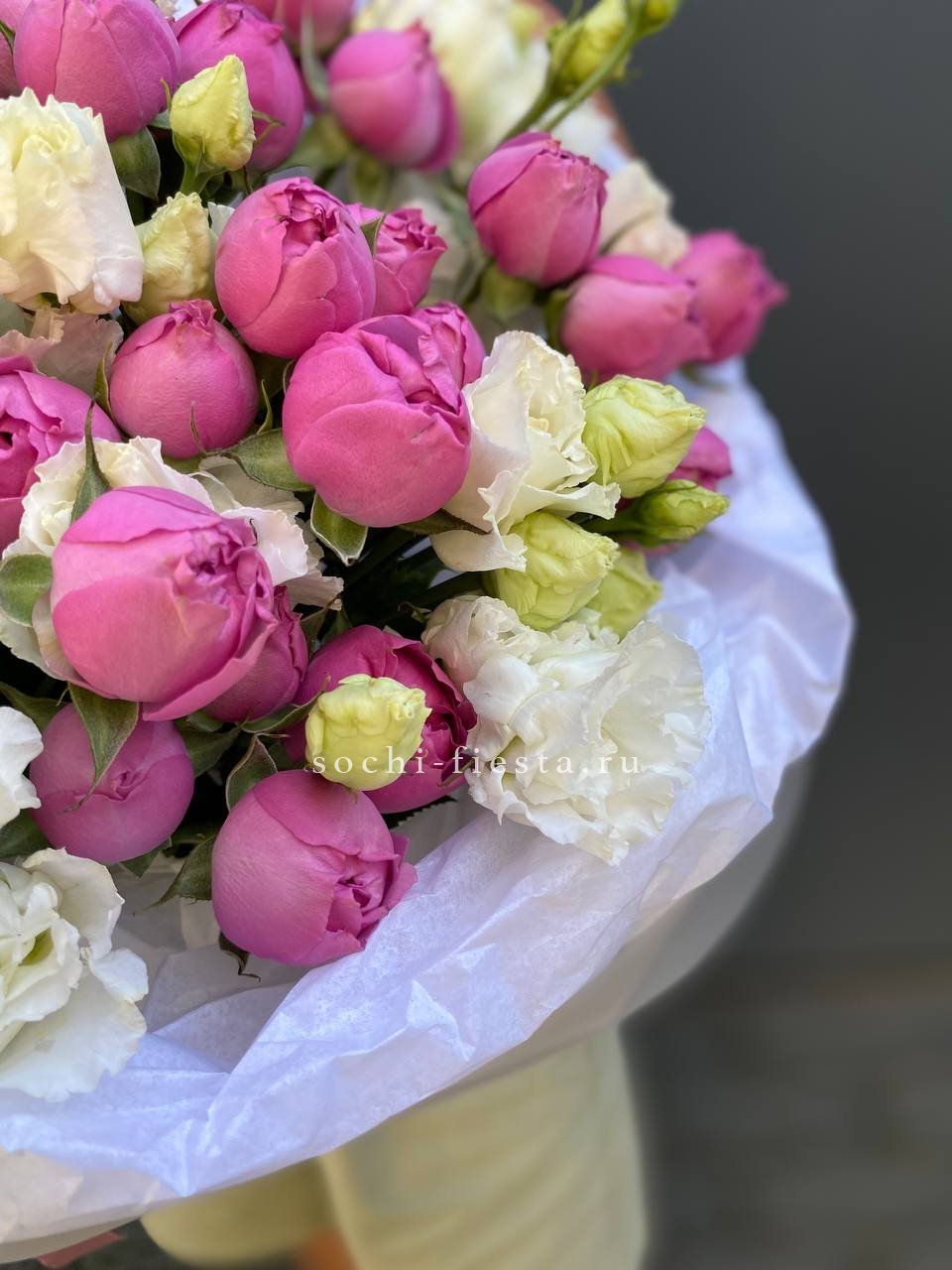 Кустовые розы и эустомы собраны в компактную форму с мягкими линиями. Сочетание нескольких оттенков создаёт живописный эффект без лишней пышности.
