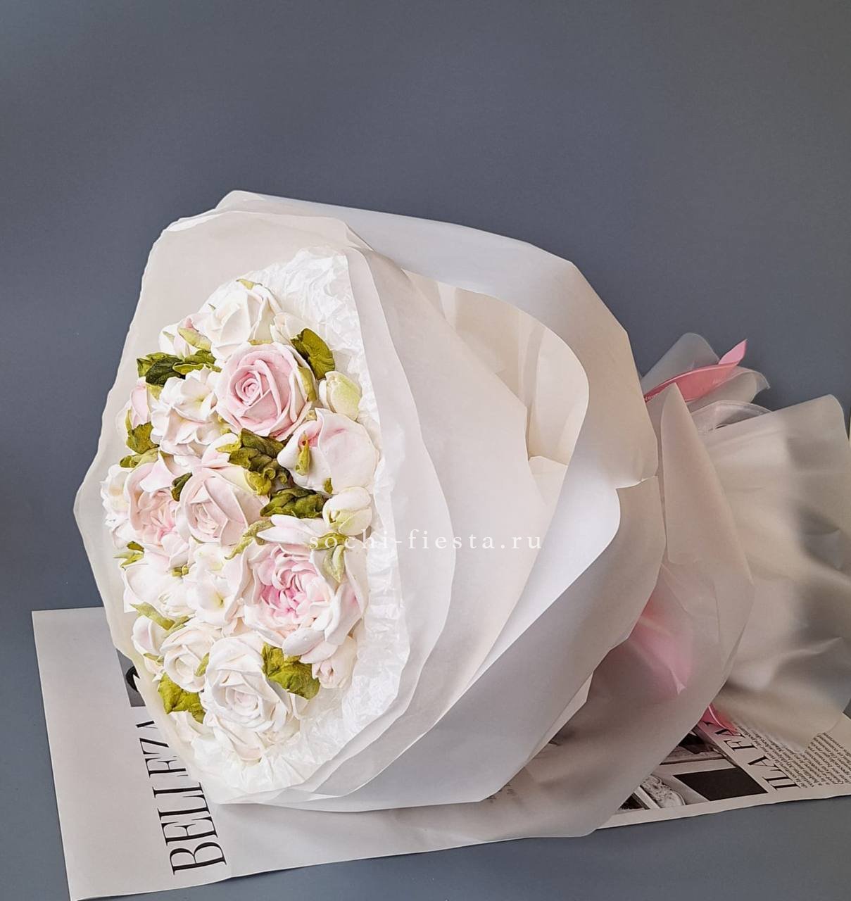 кустовые розы, эустомы, лента и дизайнерская пленка.
