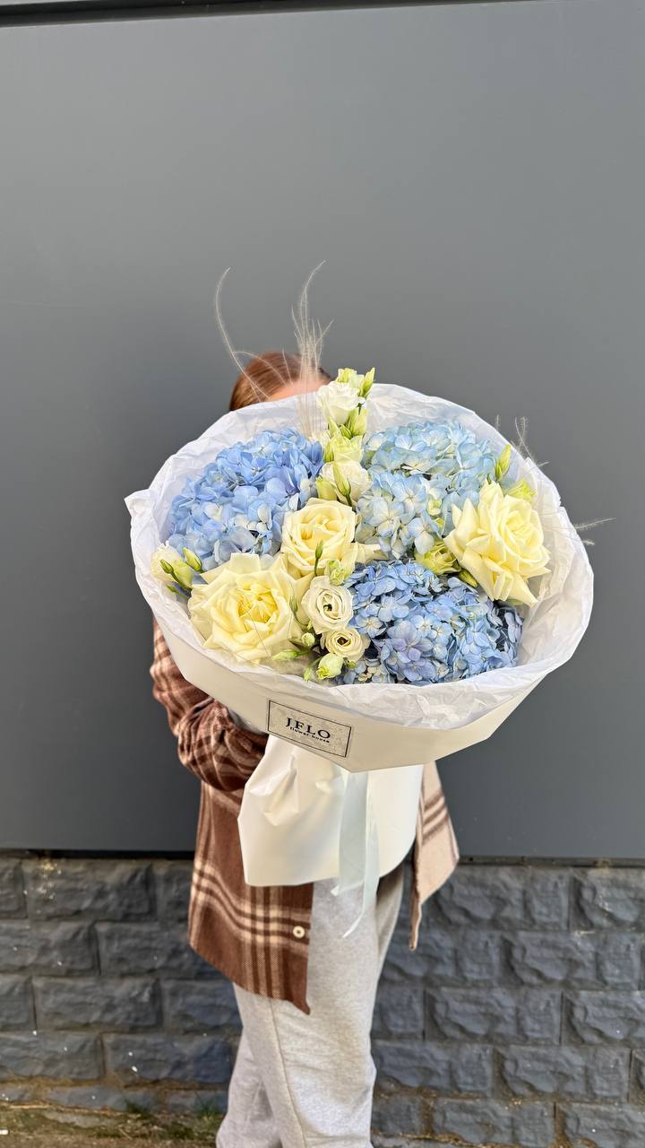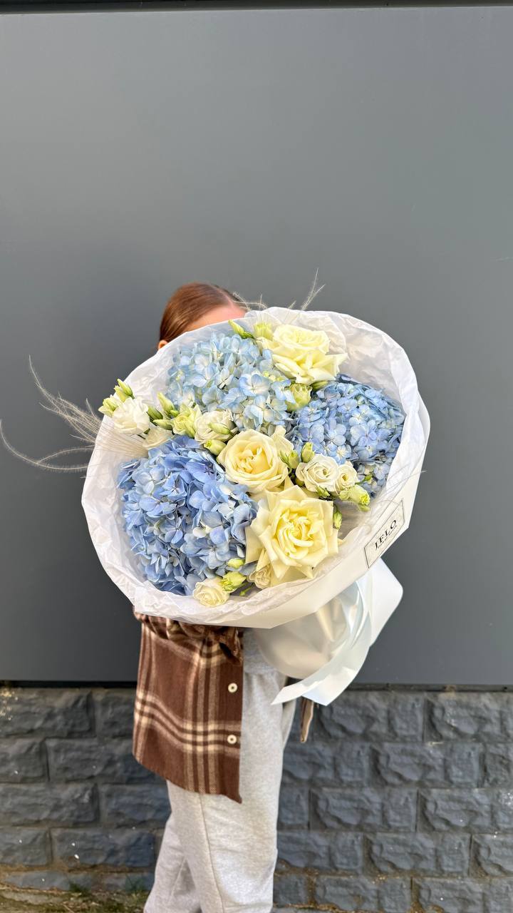 Монохромная палитра с многослойной структурой. Французские розы и эустомы чередуются с кустовыми бутонами, гортензии заполняют объём, а диантусы создают точечные акценты. Букет выглядит цельно и графично.