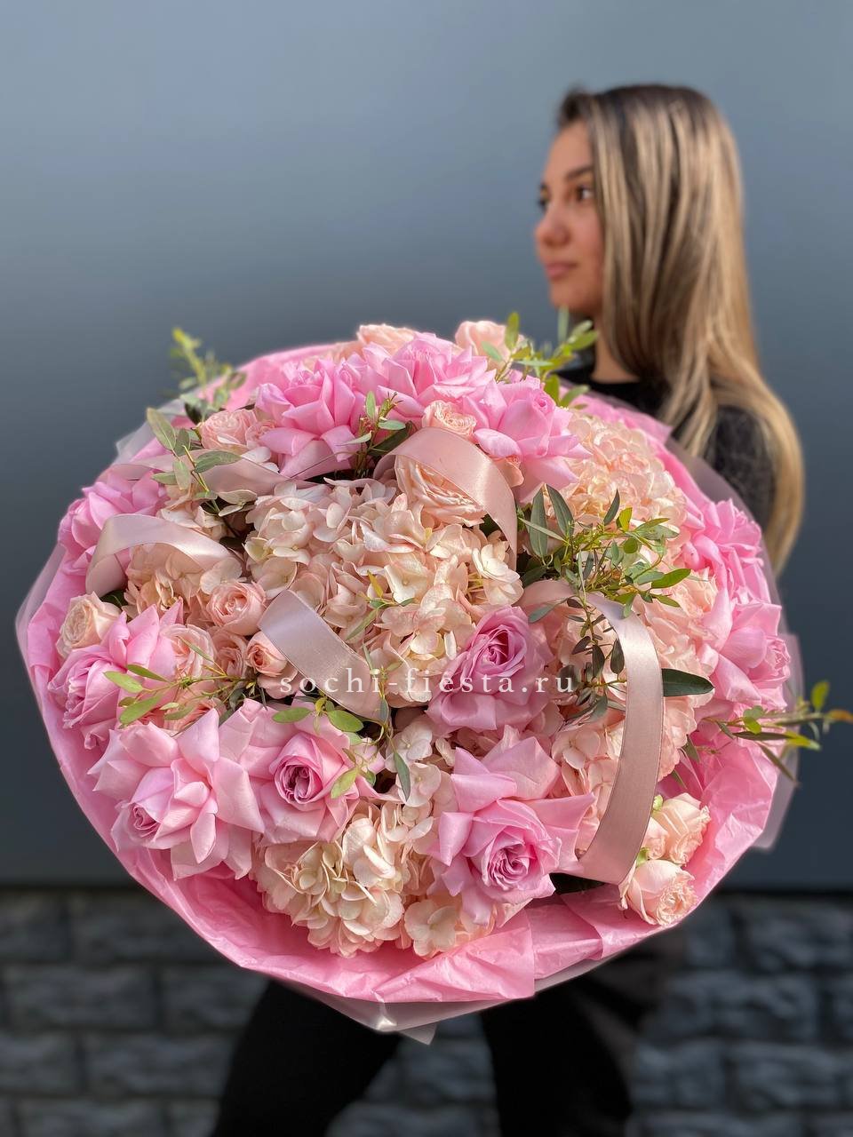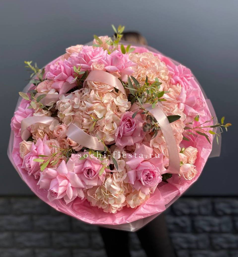 кустовые розы, гортензии, французские розы, диантусы, эустомы, лента и дизайнерская пленка.
