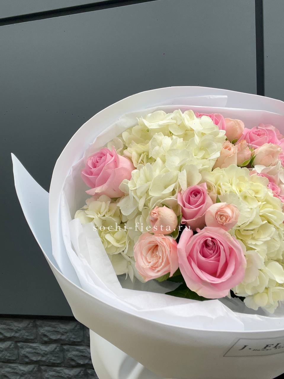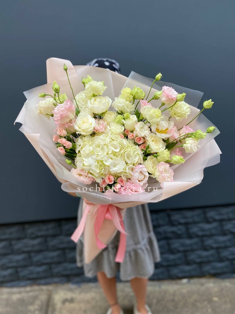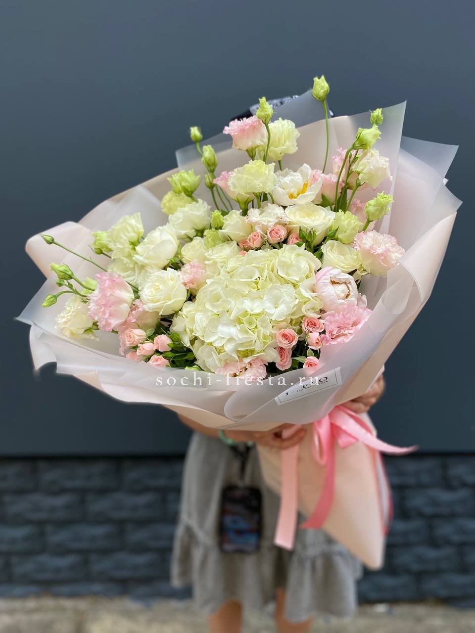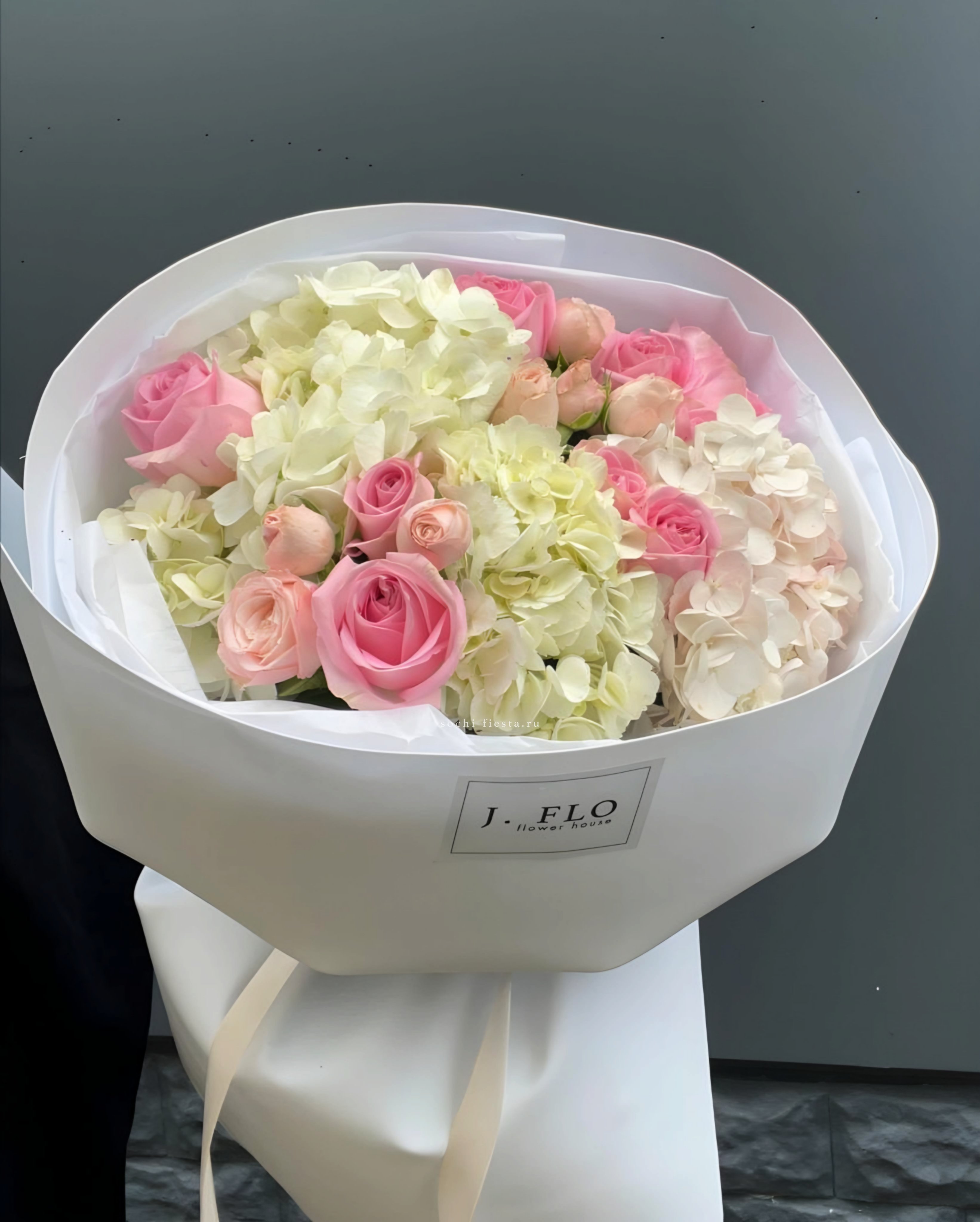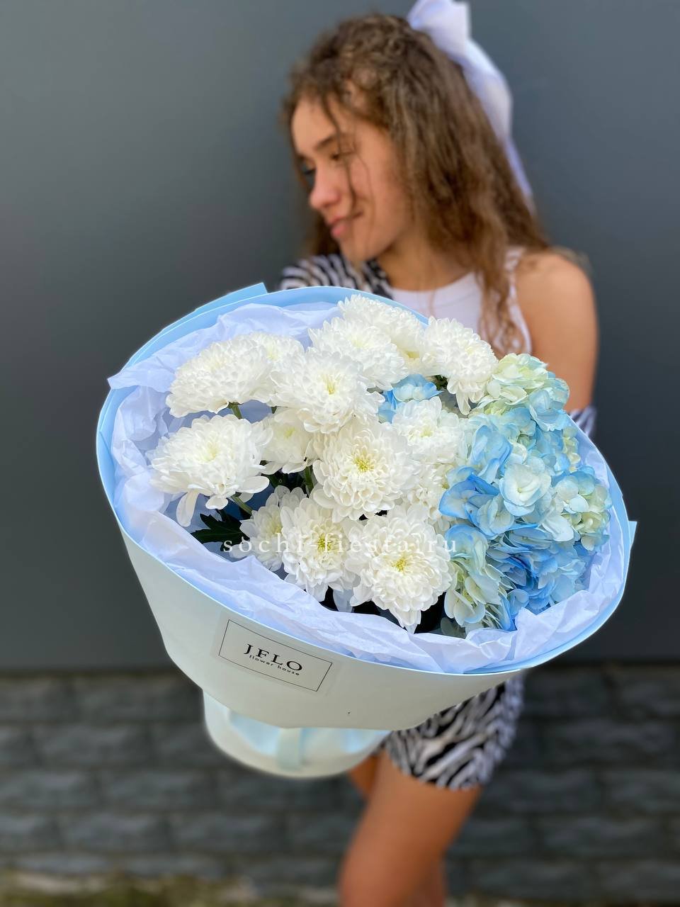 Пастельные оттенки гортензий переплетаются с белоснежными хризантемами, создавая воздушную дымку. Мягкие переходы тонов напоминают утренний туман над садом.