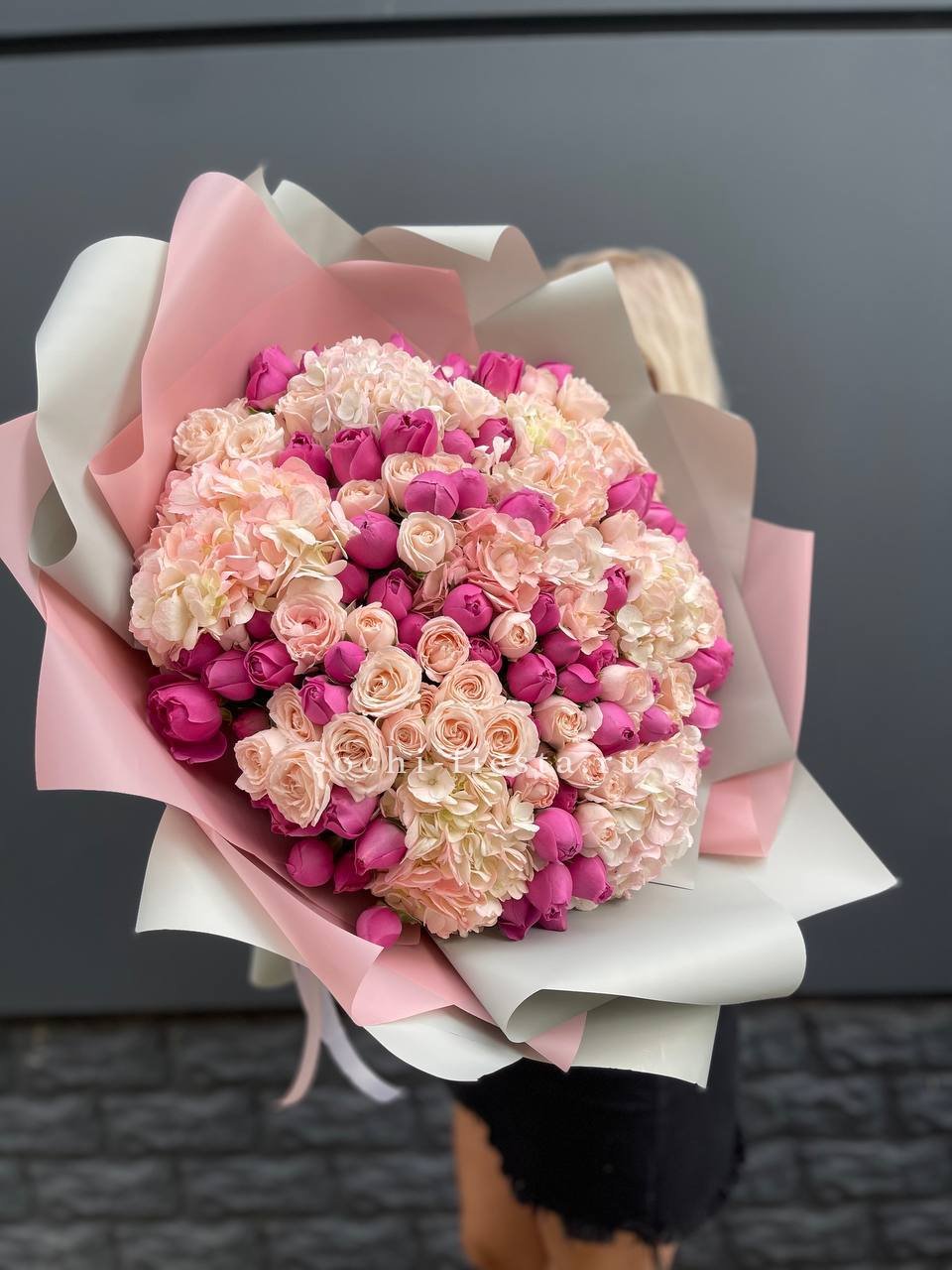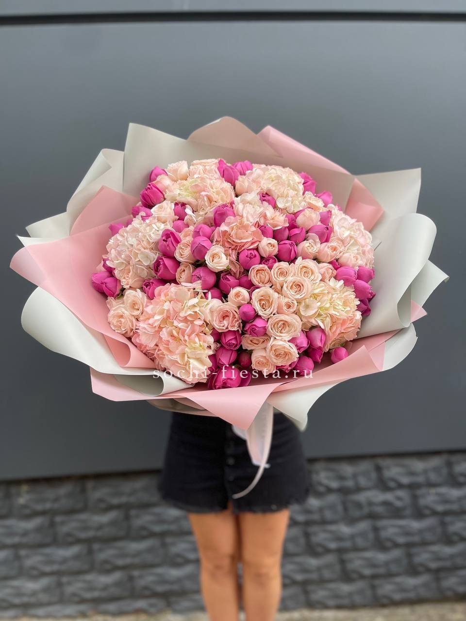 Белоснежные розы и пышные шапки гортензии сплетаются в плотную композицию, где эвкалипт задаёт спокойный ритм. Букет хорошо держит форму и долго сохраняет свежесть в вазе.
