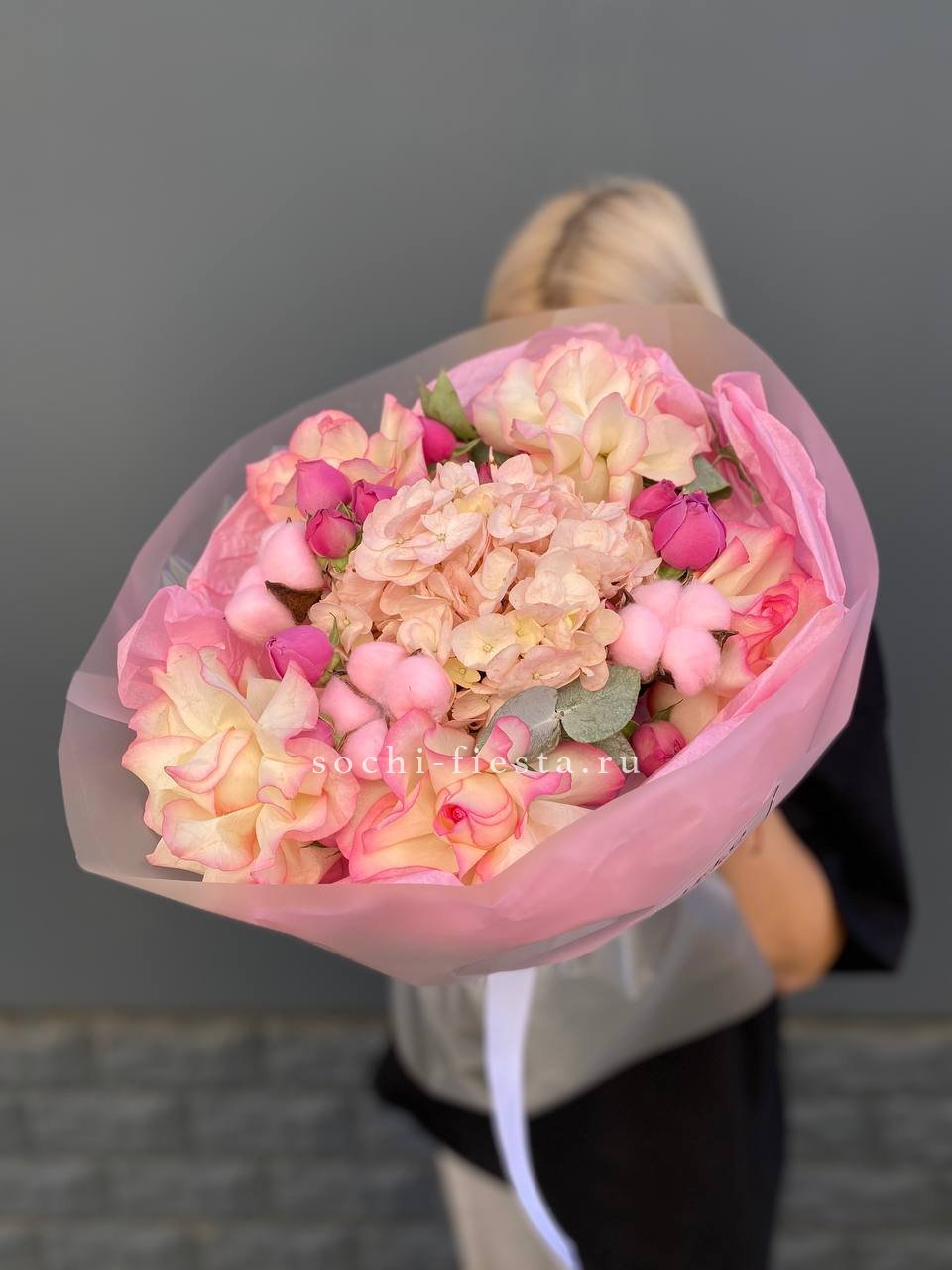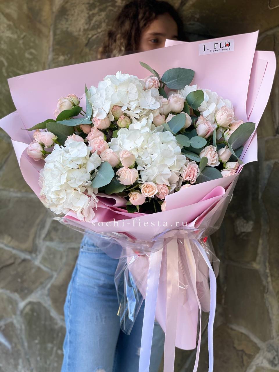 Крупные бутоны Джумилии соседствуют с воздушной гортензией и россыпью кустовых роз. Эвкалипт и хлопок создают спокойный фон для нежной палитры.