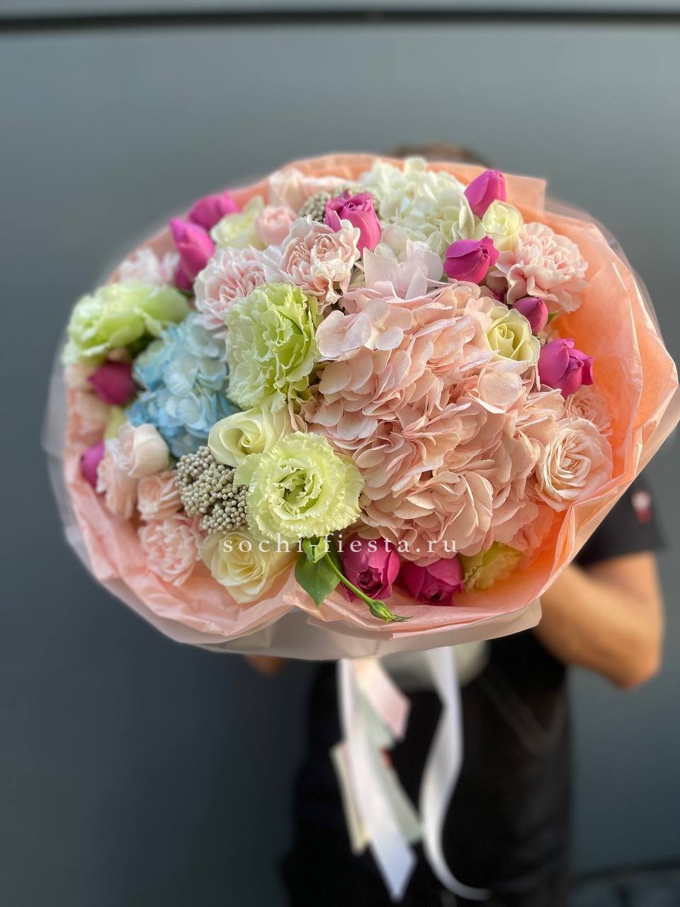 гортензия, розовые розы, кустовые розы, маттиолы,, лимониум лента и дизайнерская пленка.