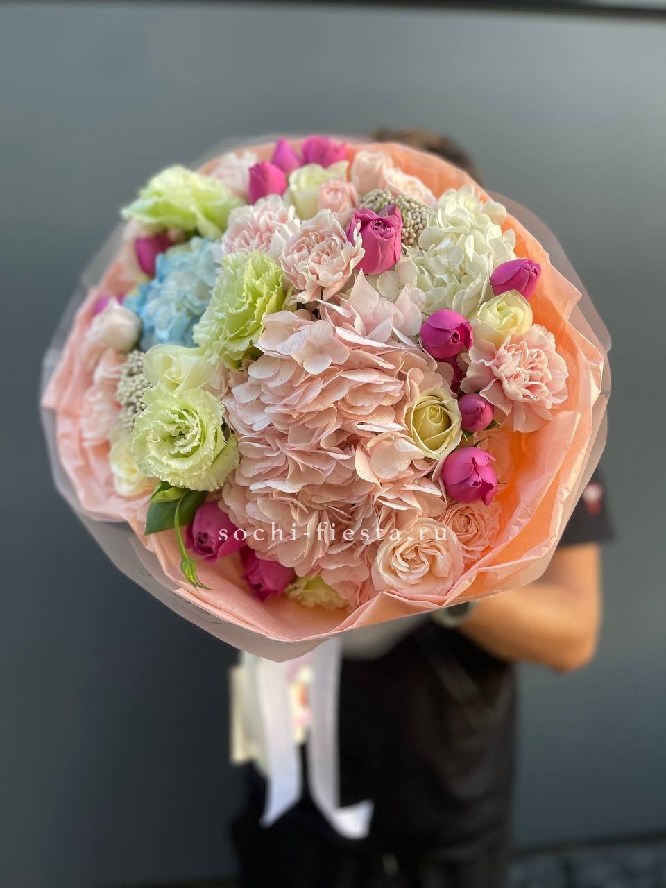 Воздушная гортензия окружена розовыми бутонами и душистой маттиолой. Лимониум добавляет букету лёгкую дымку, а общий силуэт остаётся мягким и собранным.