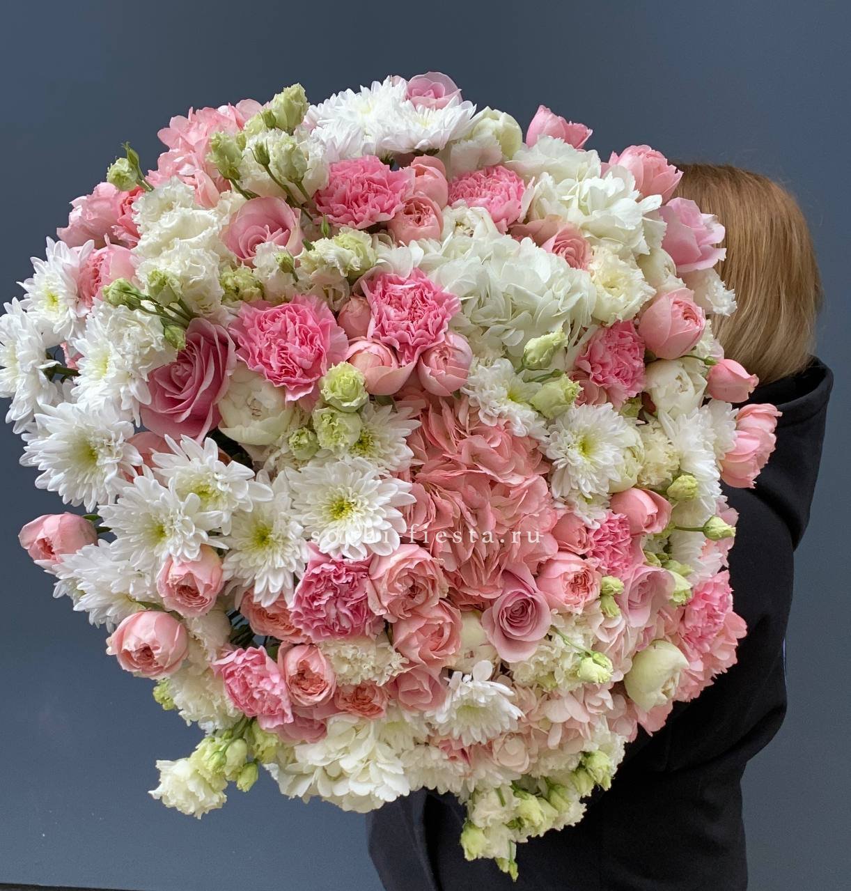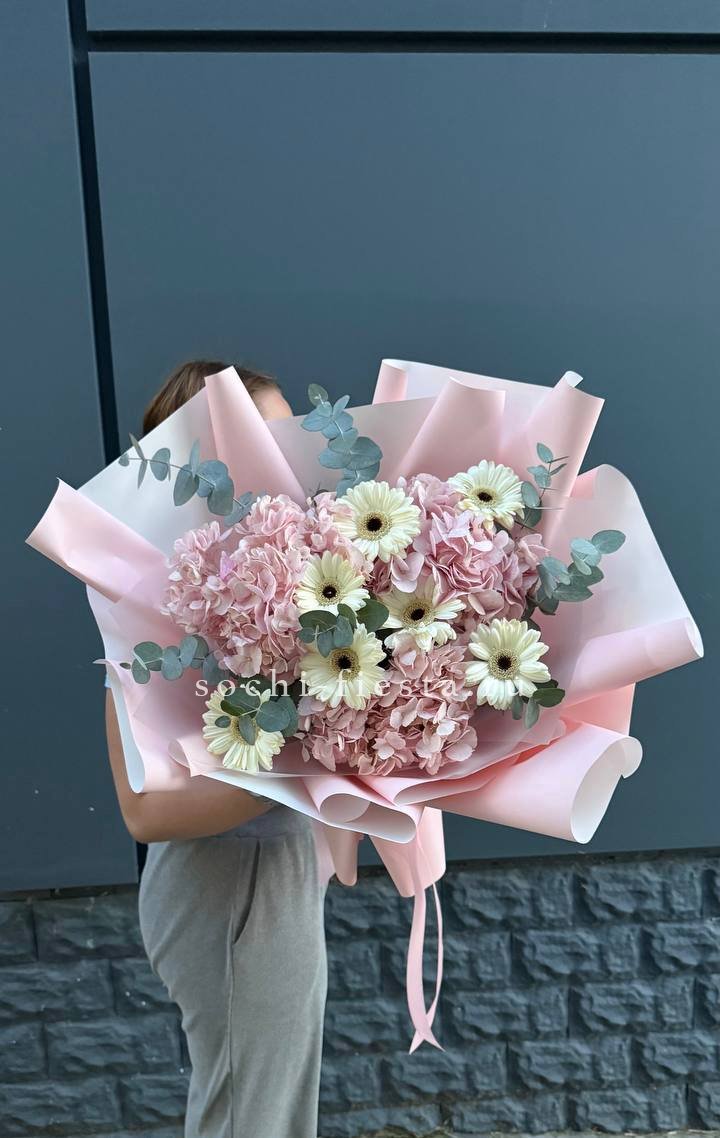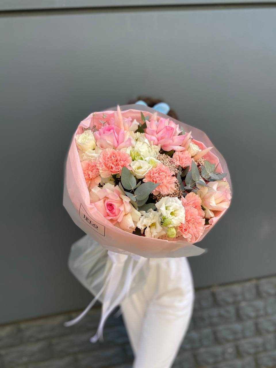 хризантема, гортензия, розовая роза, эустома, пионы ( может меняться, в зависимости от сезона), бомбастик, диантус, лента.
