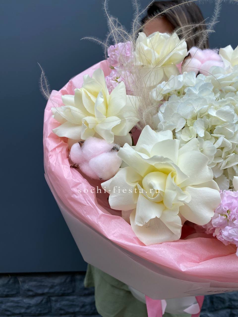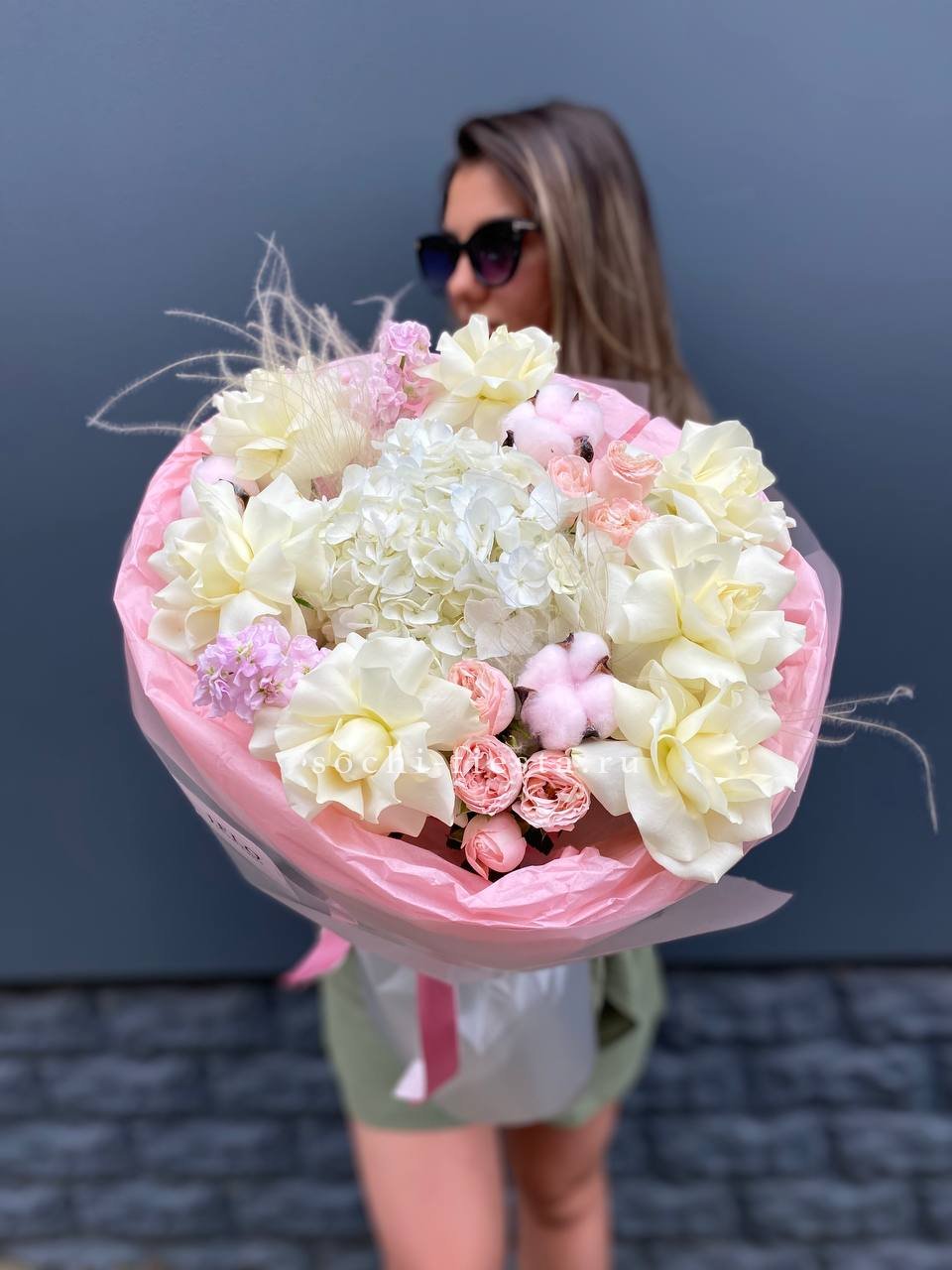 Масштабная композиция с пионами, эустомой и розами разворачивается во всей красе. Хризантемы и гортензия создают впечатляющее присутствие, которое преображает пространство вокруг.