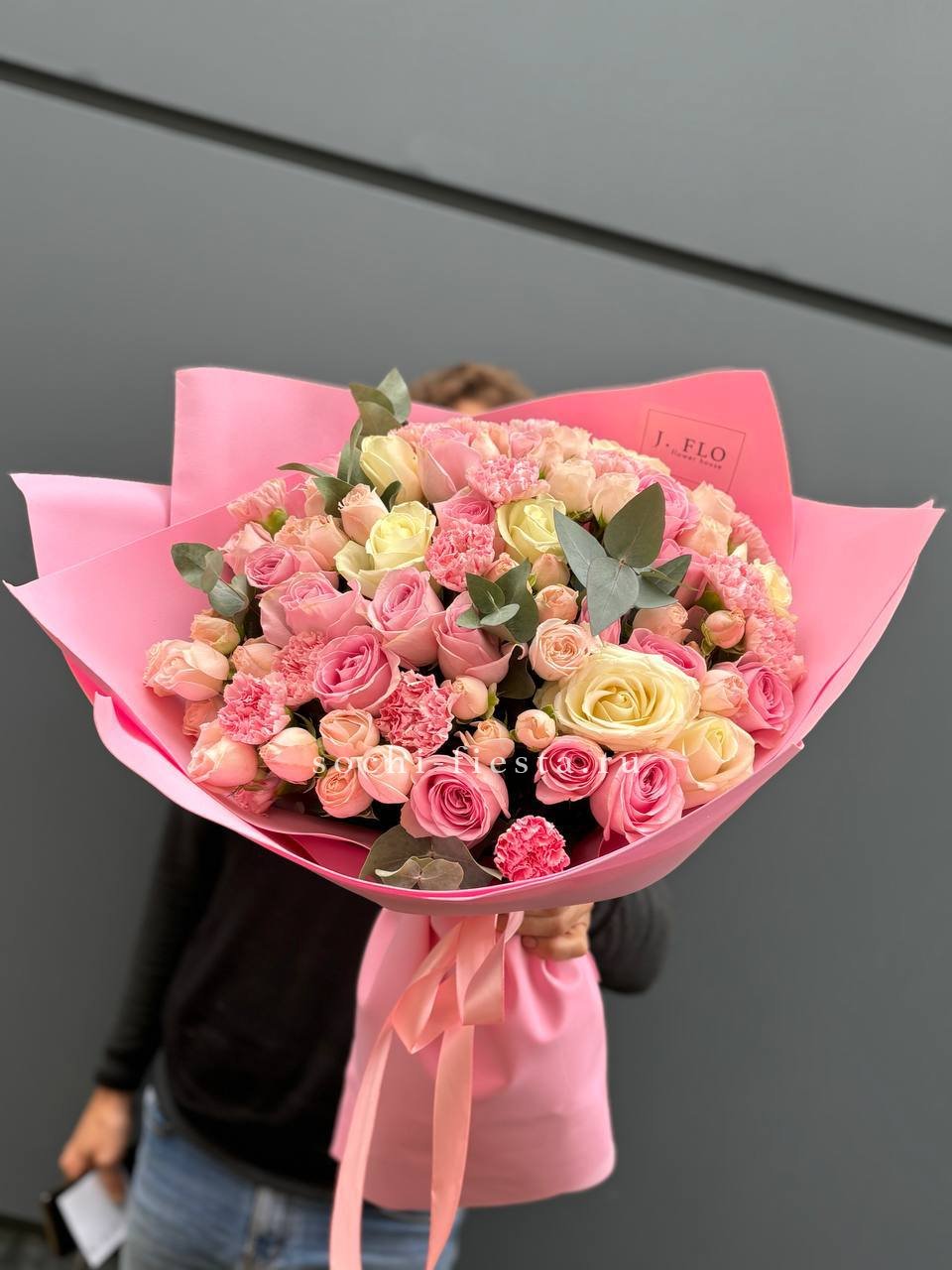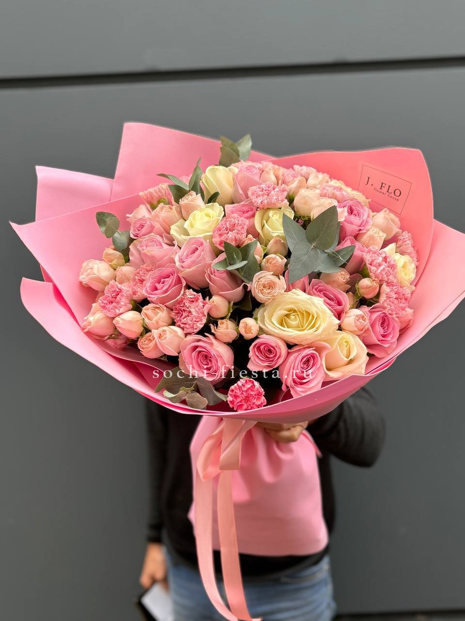 Крупные головки роз раскрываются широко, создавая объёмную фактуру с глубиной. Диантусы заполняют пространство между бутонами, формируя плотную структуру. Букет занимает много места и сразу привлекает внимание.