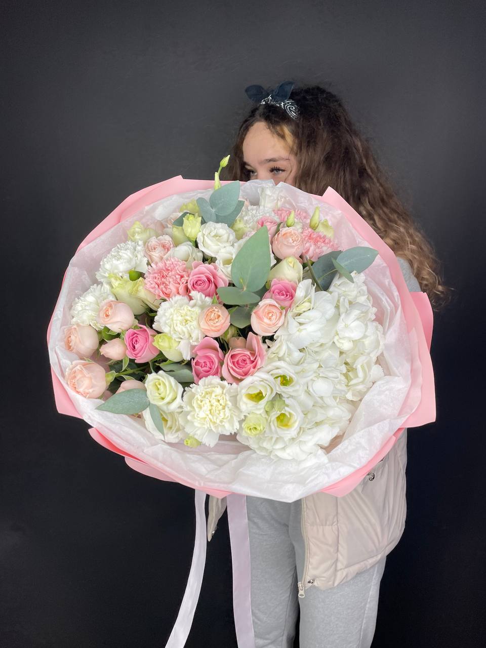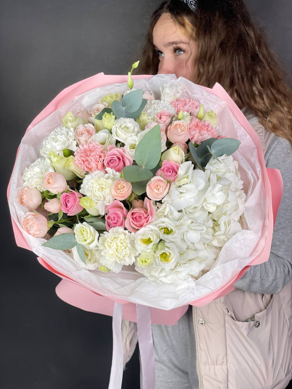 Пышная шапка из роз двух оттенков с объёмной гортензией и воздушным диантусом создаёт мягкий переход от белого к розовому. Бомбастик добавляет букету плотности, а эвкалипт освежает общую композицию. Универсальное решение для яркого поздравления.