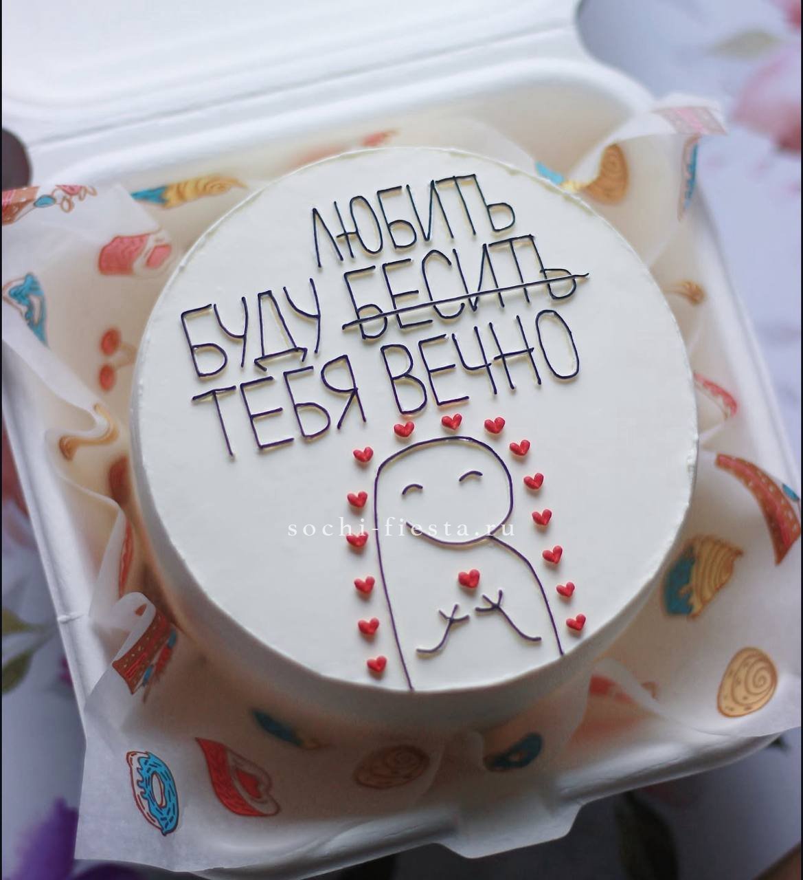 Авторский бенто-торт с романтичным посланием и яркой розово-красной палитрой. Крем формирует мягкие волны и объёмные детали декора. Компактный формат для личного момента.
